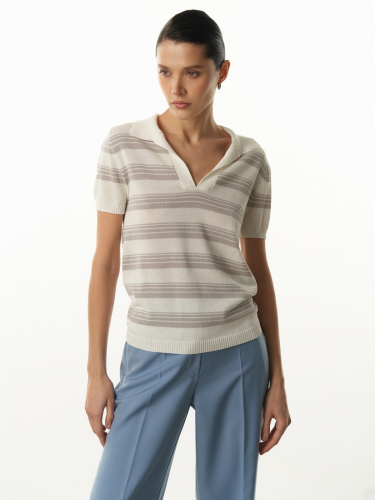 Классический джемпер полуприлегающего кроя с контрастными горизонтальными полосами – элегантный и универсальный. То, что нужно для жарких дней и комфортного самочувствия. Материал – легкий мягкий трикотаж гладкой вязки на основе вискозы. V-образный вырез с отложным воротником, манжеты, и низ оформлены фактурной резинкой. Выбирайте цвет под лук и настроение: молочно-коралловый, молочно-бежевый, молочно-серый. 89% вискоза, 11% нейлон