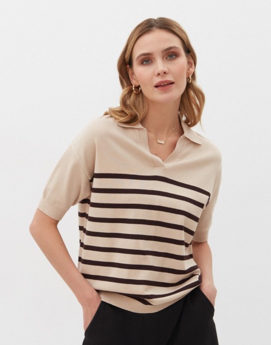 Трикотажная футболка-поло в полоску – оригинальная и стильная вещь. Модель средней длины прямого силуэта будет уместна в каждом гардеробе. Футболка изготовлена из мягкого трикотажа в свежих весенних цветах. 70% вискоза, 30% нейлон