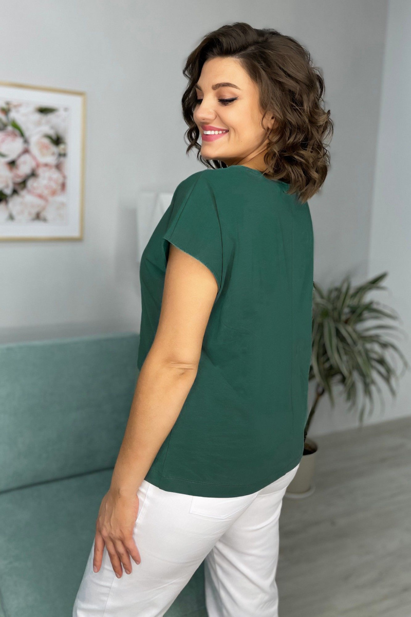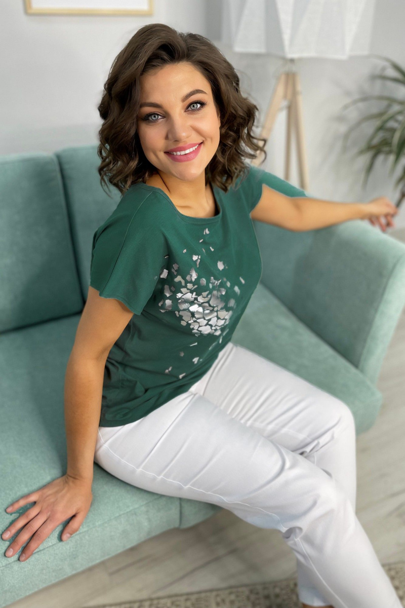 "Футболка из трикотажной хлопковой ткани, со спущенным плечом. Перед футболки с принтом. Вырез горловины круглый, оформлен бейкой. Спинка со средним швом.