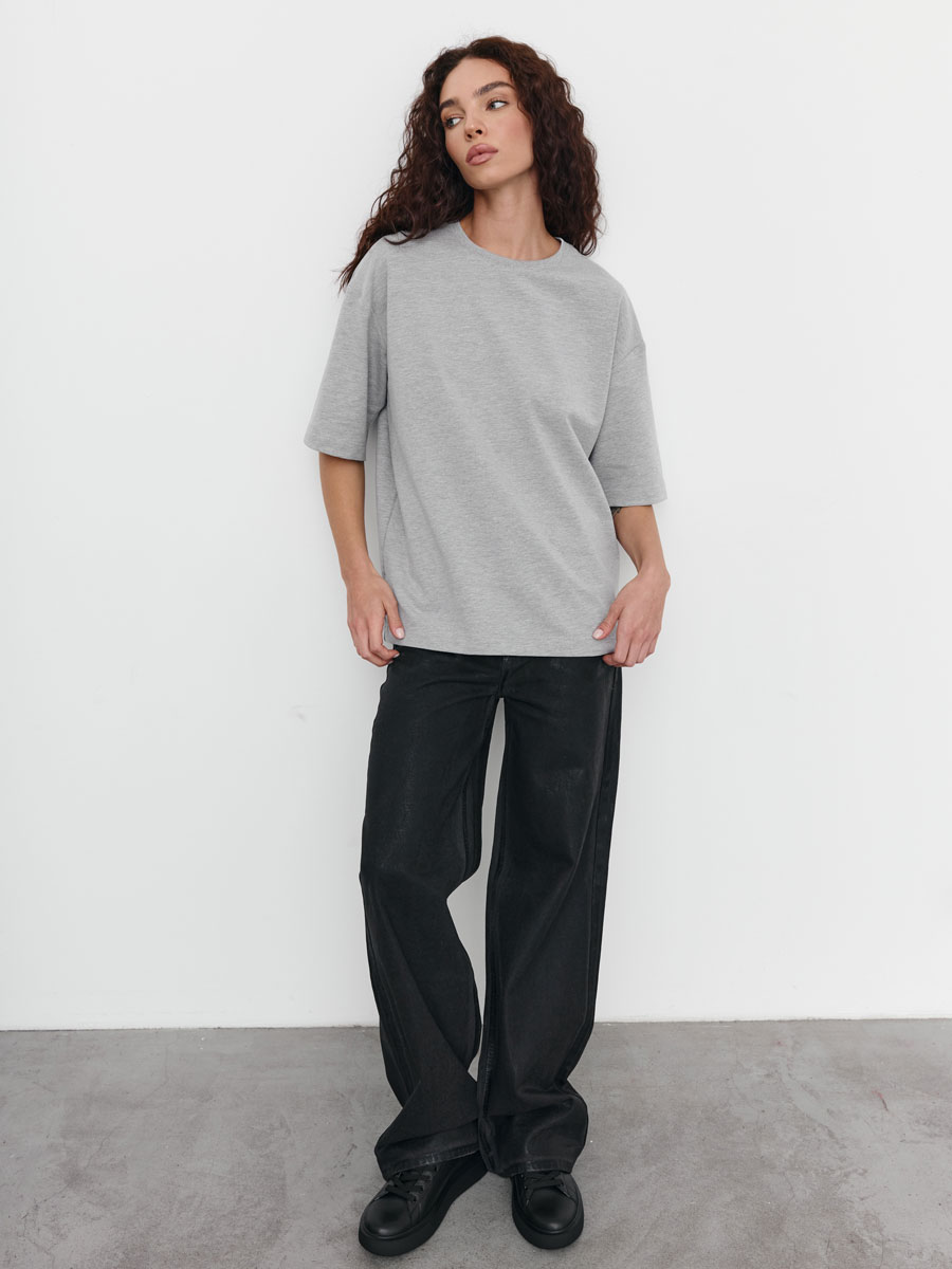Женская футболка OVERSIZE из футера 2-х нитки с лайкрой, с втачным коротким рукавом. Горловина обработана бейкой из кашкорсе. Низ изделия и низ рукава подвернуты и подшиты.
