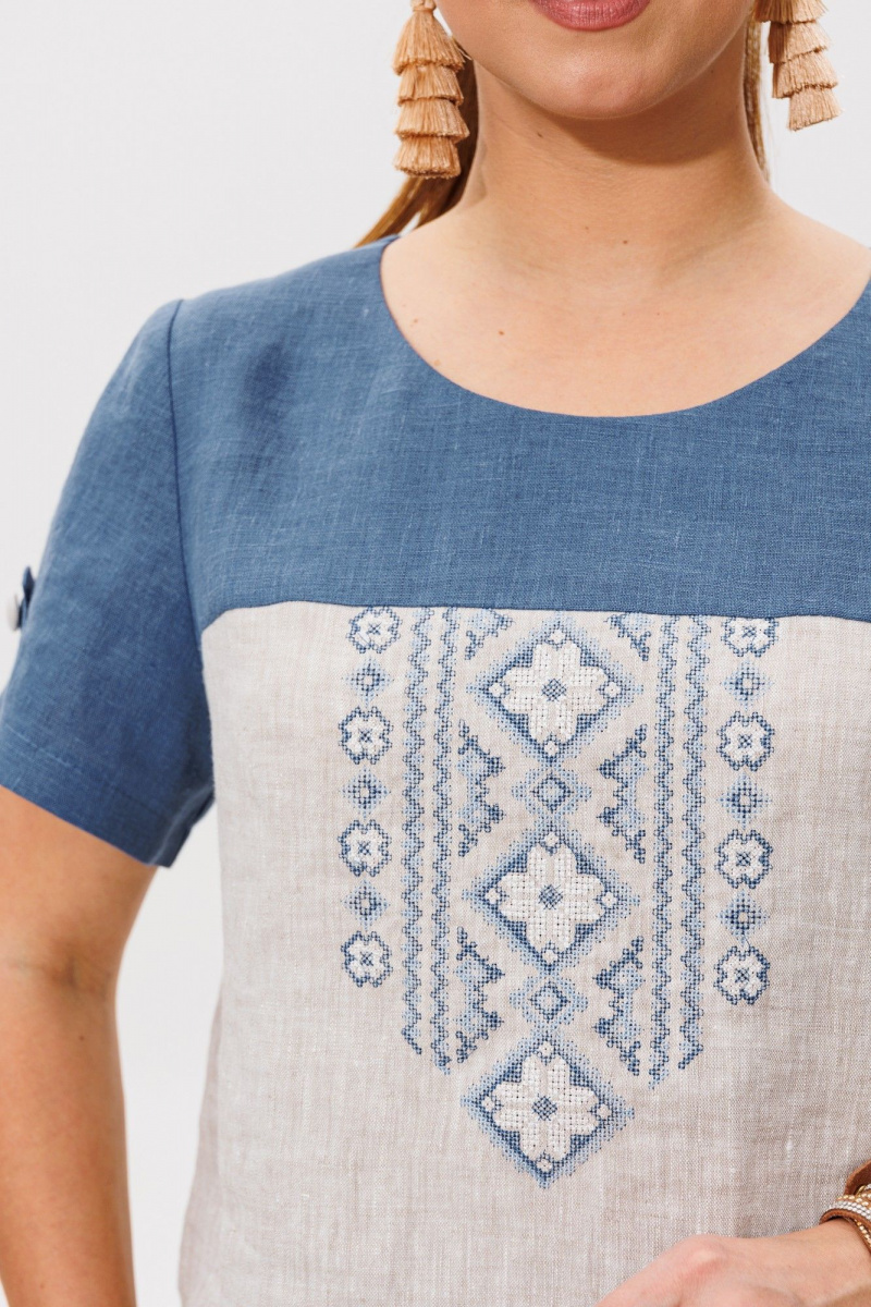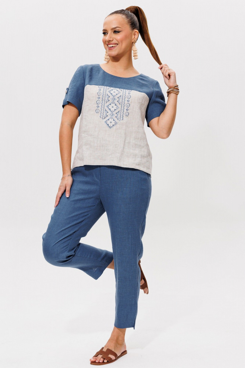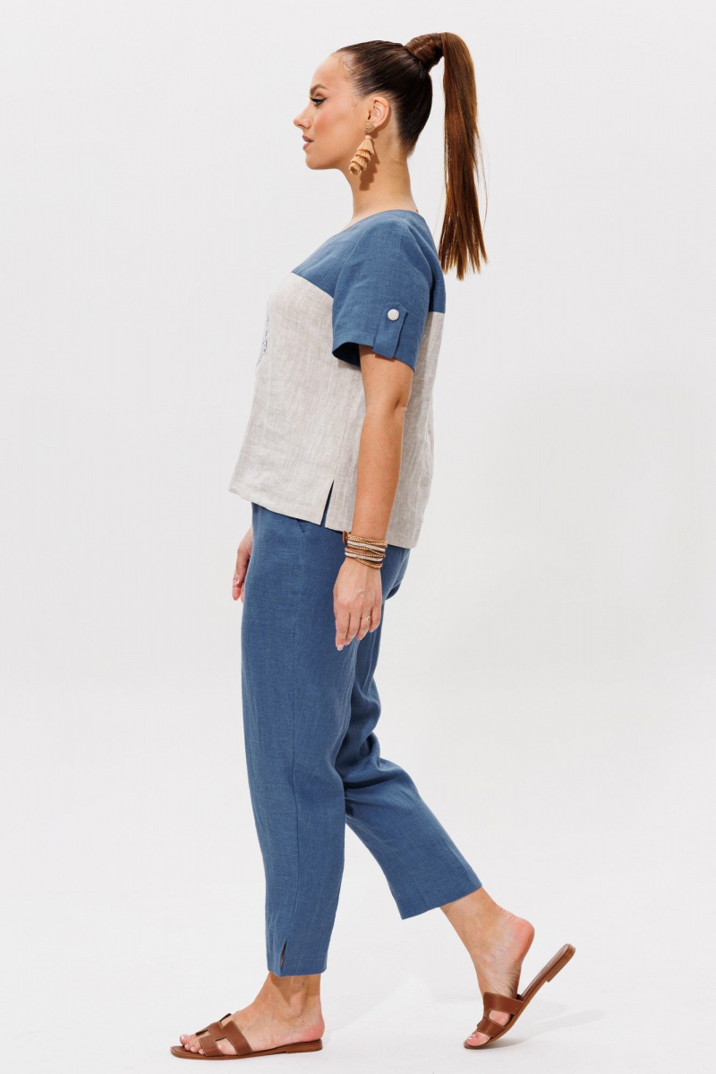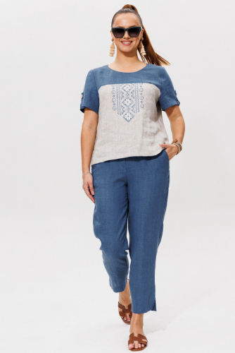 Очень стильный, удобный комплект состоящий из блузки и брюк, выполнен из 100% льна двух цветов. Блузка прямого силуэта с коротким рукавом который украшен патой, застёгивающий на петлю и пуговицу .Авторская вышивка в народном стиле, очень украшает данное изделие.