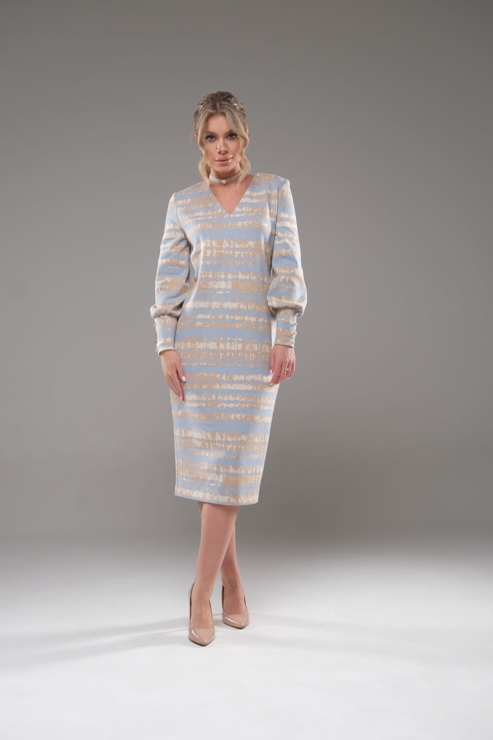 Платье женское, трикотажное полуприлегающего силуэта. v-образным вырезом по переду.Со средним швом заканчивающиеся разрезом.Рукава прямые собирающиеся с низу на манжет. Платье длиной ниже линии колена. На манжетах нашиты 4 декоративные пуговицы.