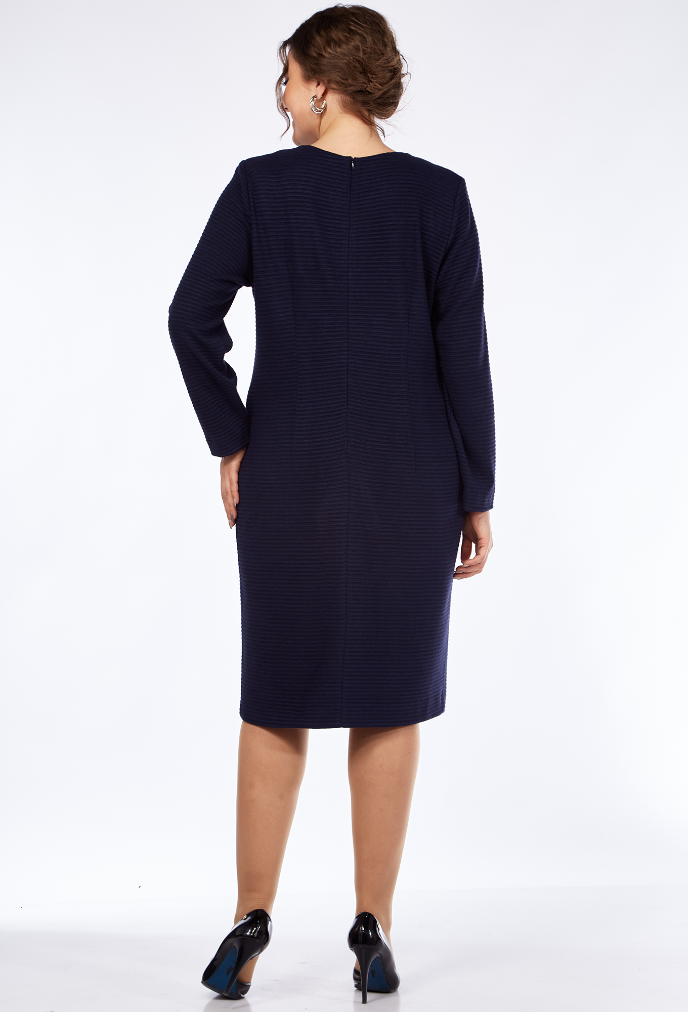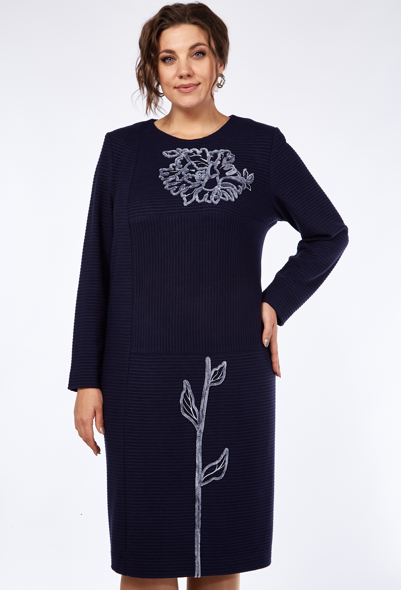 Платье женское полуприлегающего силуэта из трикотажного полотна без подкладки. Платье с круглым вырезом горловины. По переду имеются асимметричные детали, на двух из которых расположена декоративная вышивка. Спинка со средним швом, талиевыми вытачками и застежкой на потайной молнии. Длина платья ниже колена. Рукав втачной одношовный.