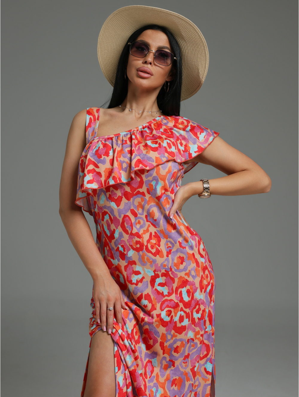 Платье длиной макси, приталенное, с ассиметричной горловиной, с воланом на сборке по горловине.