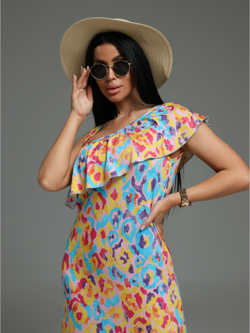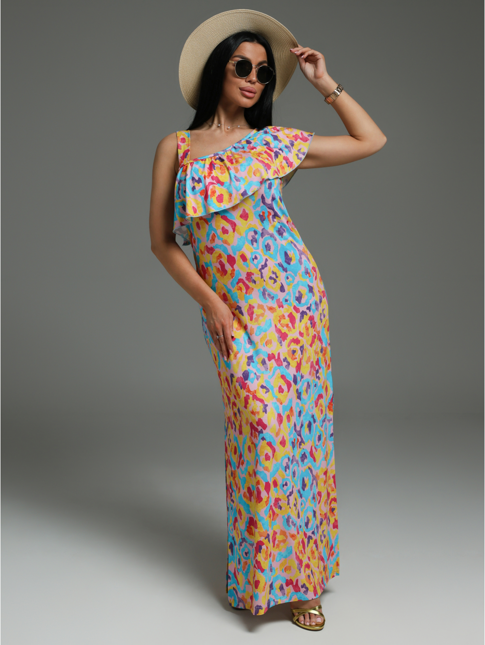 Платье длиной макси, приталенное, с ассиметричной горловиной, с воланом на сборке по горловине.