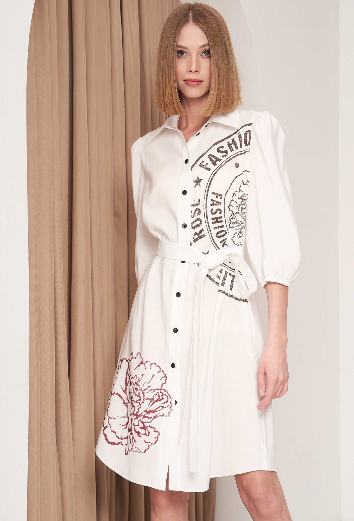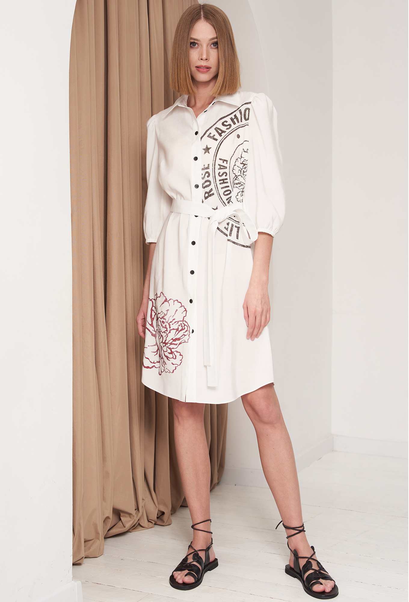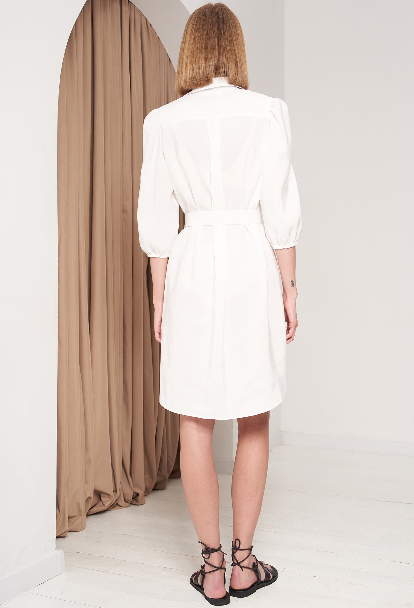Платье прямого силуэта с центральной застежкой на петли и пуговицы с цельнокроеной планкой и рубашечным воротником с отрезной стойкой. Перед с нагрудными вытачками и настрочным клапаном в районе груди. Спинка с отрезной кокеткой и встречной складкой. Рукав втачной со сборкой по окату. Низ рукава собран на резинку. Низ платья фигурный. Платье дополнено поясом из основной ткани. Фурнитура может быть изменена с сохранением художественного образа.