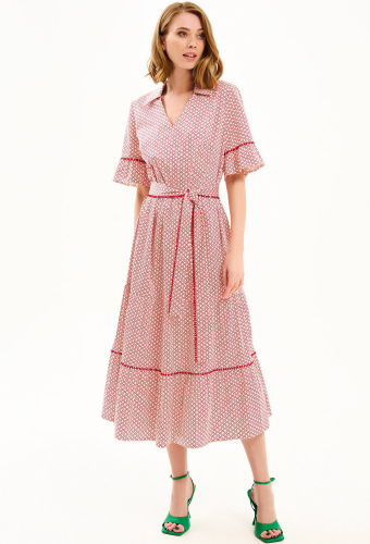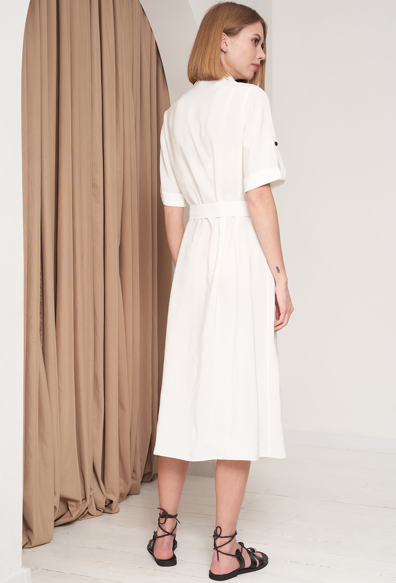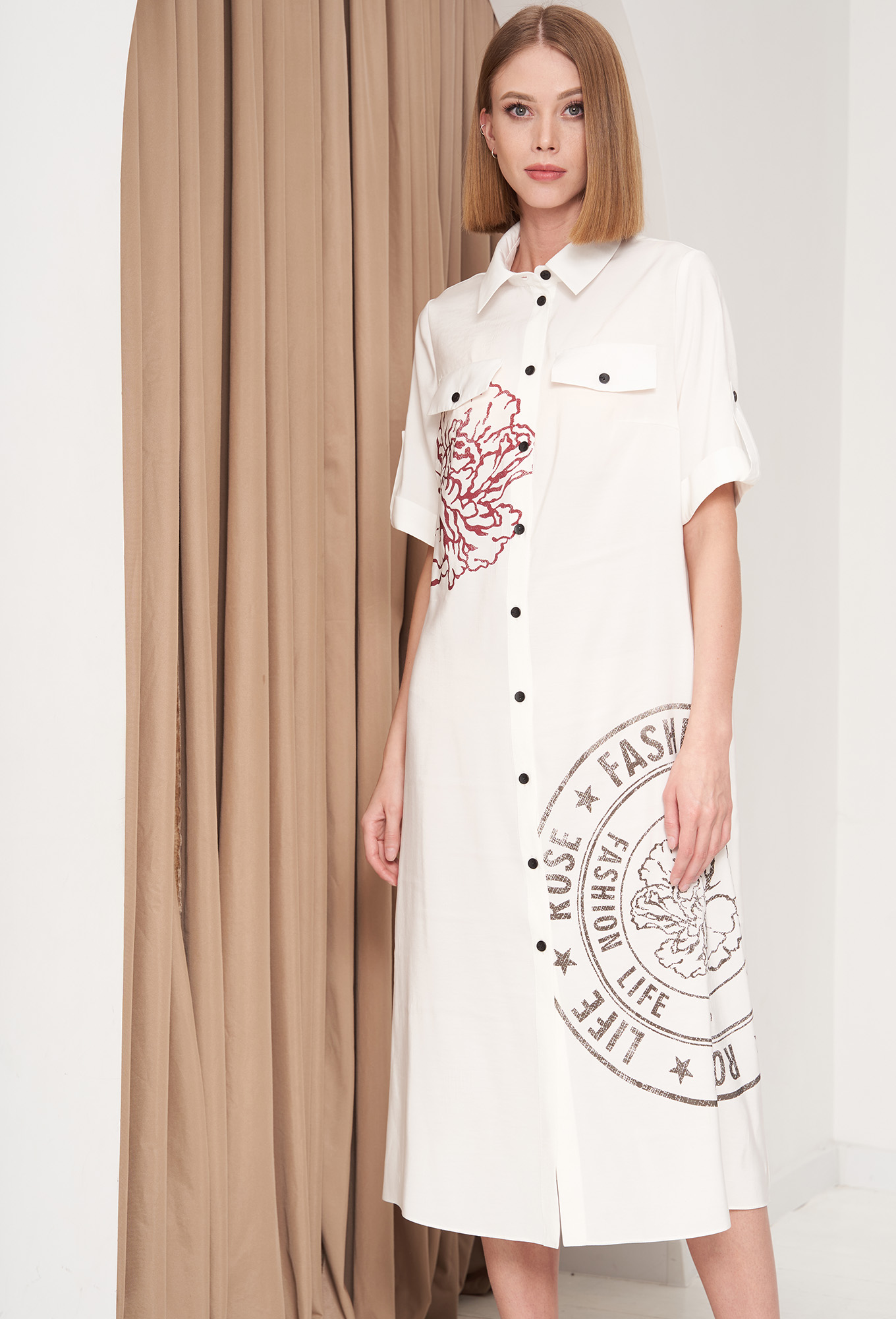 Платье силуэта трапеция с центральной застежкой и воротником рубашечного типа. Перед с нагрудной вытачкой и фигурными клапанами с пуговицей в районе груди. Рукав втачной одношовный с отложной манжетой, которая пристегивается с помощью паты на 1 пуговицу. К платью прилагается съемный пояс из основной ткани. В области груди правой части переда и ниже талии в левой части переда платье декорировано печатью. Фурнитура может быть изменена.