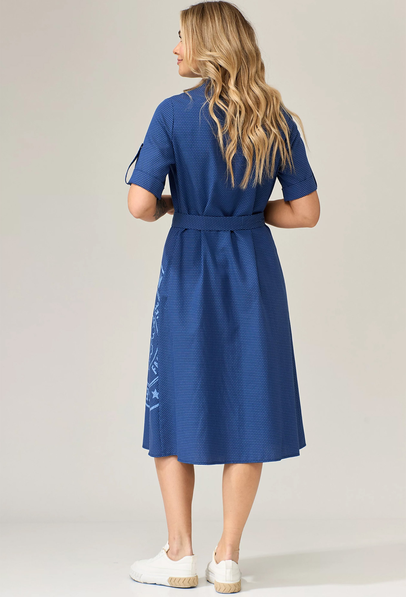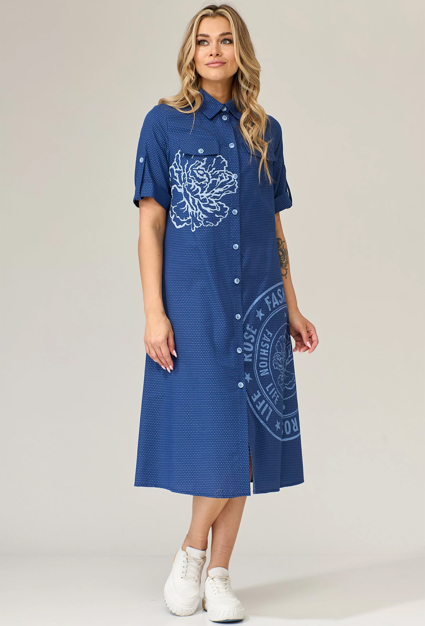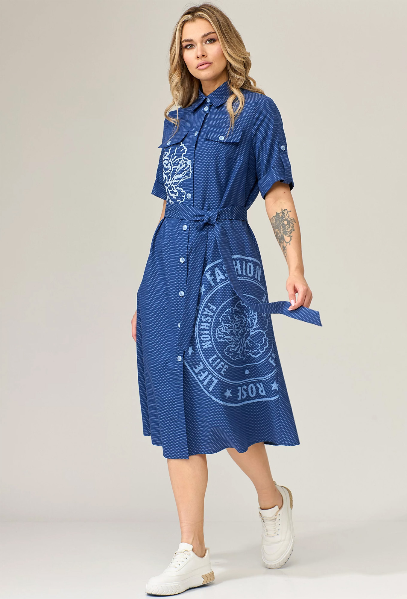 Платье силуэта трапеция с центральной застежкой и воротником рубашечного типа. Перед с нагрудной вытачкой и фигурными клапанами с пуговицей в районе груди. Рукав втачной одношовный с отложной манжетой, которая пристегивается с помощью паты на 1 пуговицу. К платью прилагается съемный пояс из основной ткани. В области груди правой части переда и ниже талии в левой части переда платье декорировано печатью. Фурнитура может быть изменена.