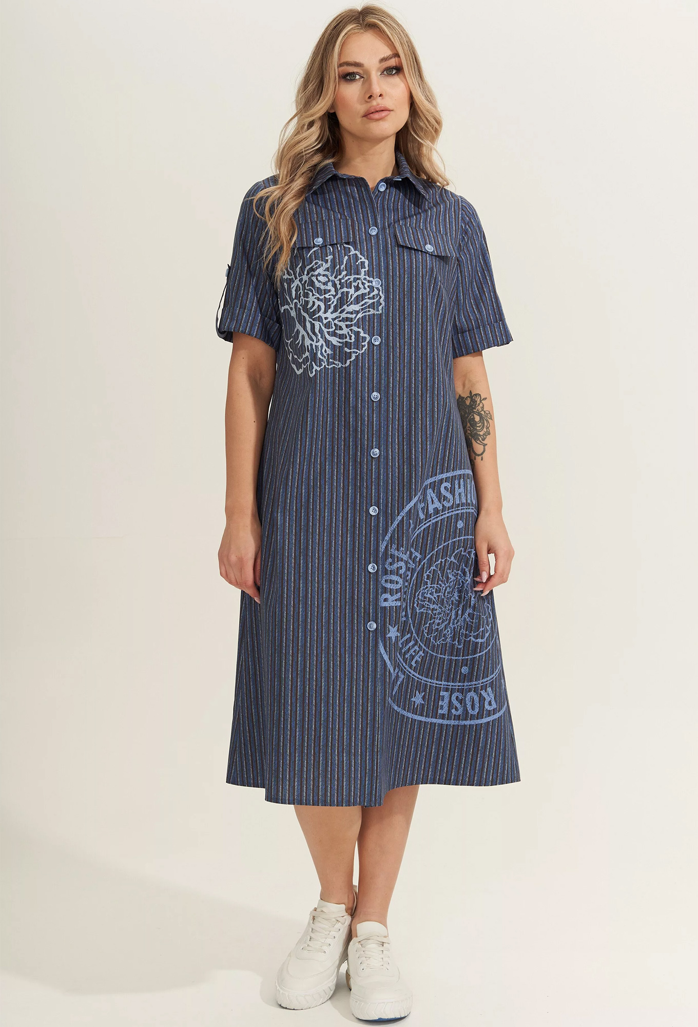 Платье силуэта трапеция с центральной застежкой и воротником рубашечного типа. Перед с нагрудной вытачкой и фигурными клапанами с пуговицей в районе груди. Рукав втачной одношовный с отложной манжетой, которая пристегивается с помощью паты на 1 пуговицу. К платью прилагается съемный пояс из основной ткани. В области груди правой части переда и ниже талии в левой части переда платье декорировано печатью. Фурнитура может быть изменена.