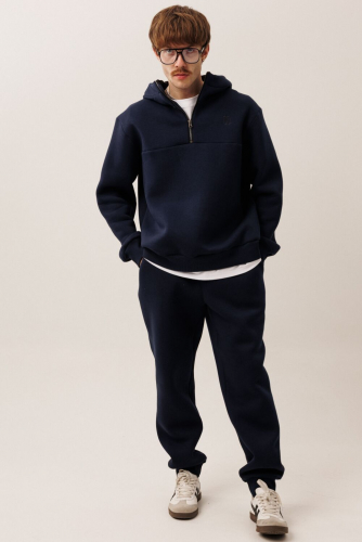 Этот спортивный костюм от GOwear отлично подойдет для дома, прогулок, путешествий и отдыха. Сделан из теплой, комфортной ткани. Состоит из джемпера и брюк. Джемпер имеет  двойной капюшон и короткую застежку - молнию черного контрастного цвета по центру переда. На переде с левой стороны выполнена вышивка в цвет ткани, а также расположена горизонтальная кокетка. Джемпер имеет прямой силуэт. Низ джемпера и манжеты выполнены из кашкорсе.  Брюки зауженные к низу с притачным поясом (резинка и шнурок внутри). Брюки с боковыми карманами. По низу брюк – манжеты.