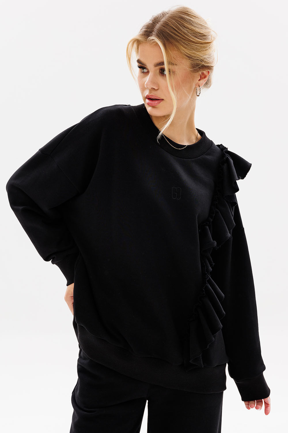Современный, женственный свитшот, покроя oversize из комфортной ткани (футера пенье). Волан с необработанным краем (укреплён строчкой для надежности) пришит асимметрично на левой стороне изделия. Свитшот имеет спущенную линию плеча, прямой силуэт и притачную манжету по низу изделия. По центру переда вышивка – логотип в цвет ткани. Рукава с притачной по низу манжетой. Бейка горловины, низ изделия и манжеты рукавов выполнены из ткани - компаньона кошкорсе.