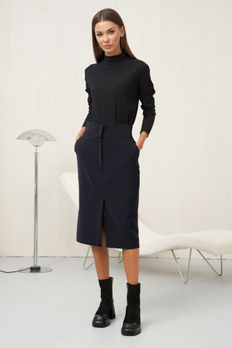 Платье прямого силуэта, без застежки , с втачным воротником- стойкой. По переду с нагрудными вытачками. Спинка со средним швом. По боковым швам- разрезы. Рукав втачной, длинный.