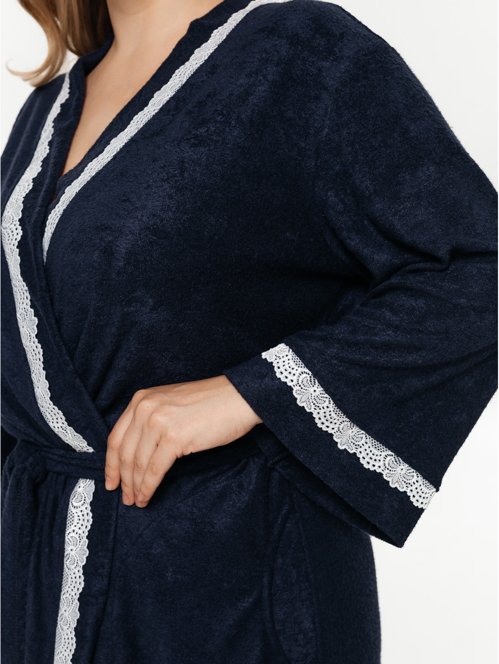 Борт и горловина декорированы кружевом. Дополнен двумя удобными карманами на боковых швах.