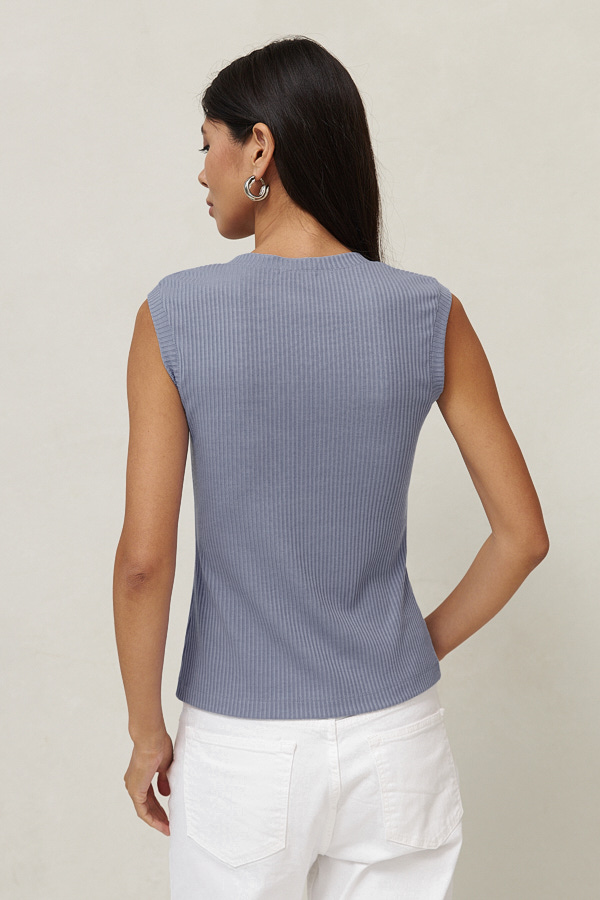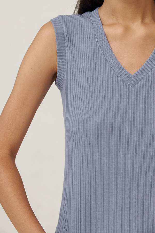 Джемпер прилегающего силуэта из эластичного полотна в рубчик. V-образный вырез горловины и линия проймы оформлены бейками.