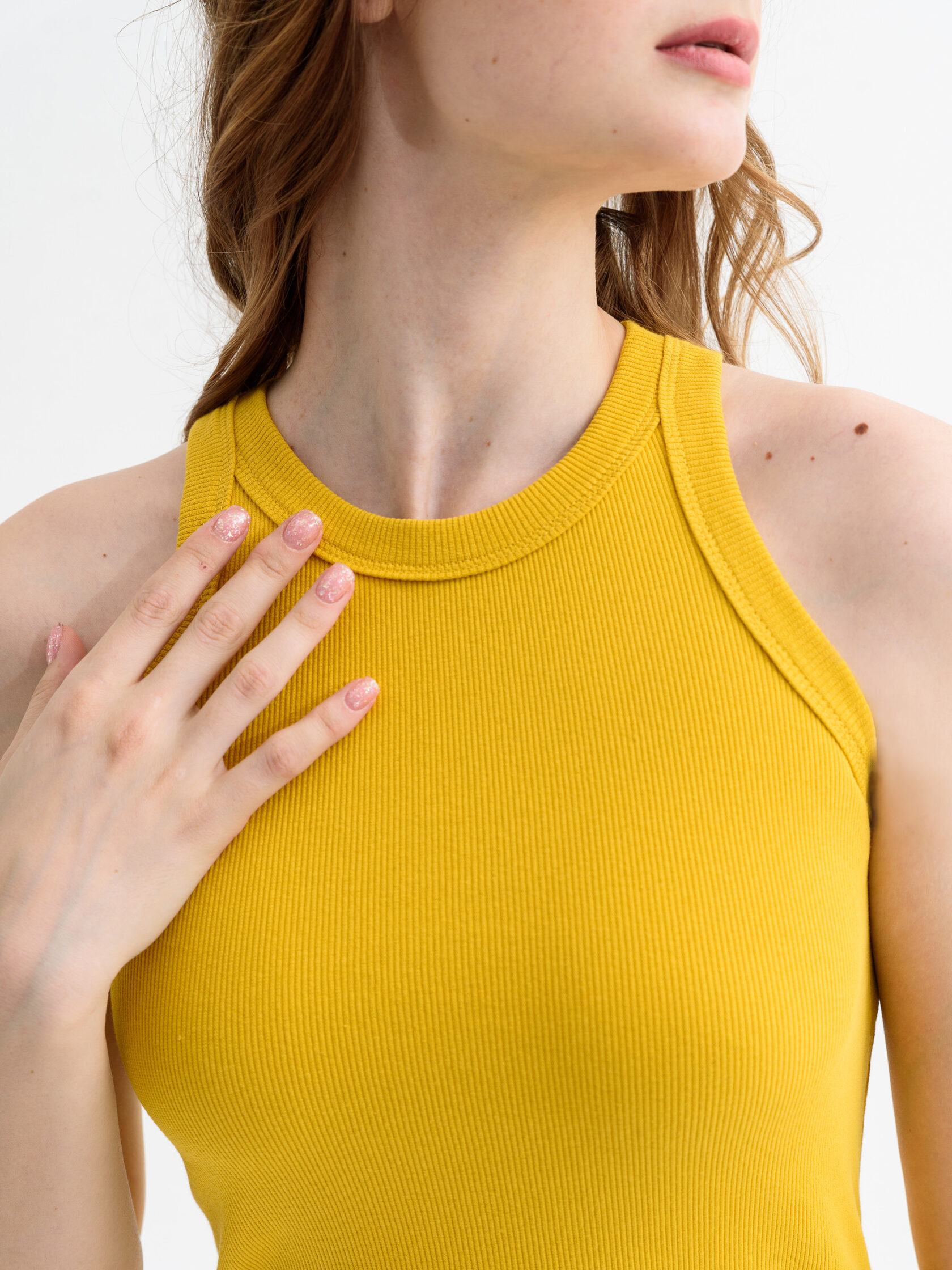 Майка женская спортивного стиля, прилегающего силуэта, из трикотажного х/б полотна с выработкой «рубчик».