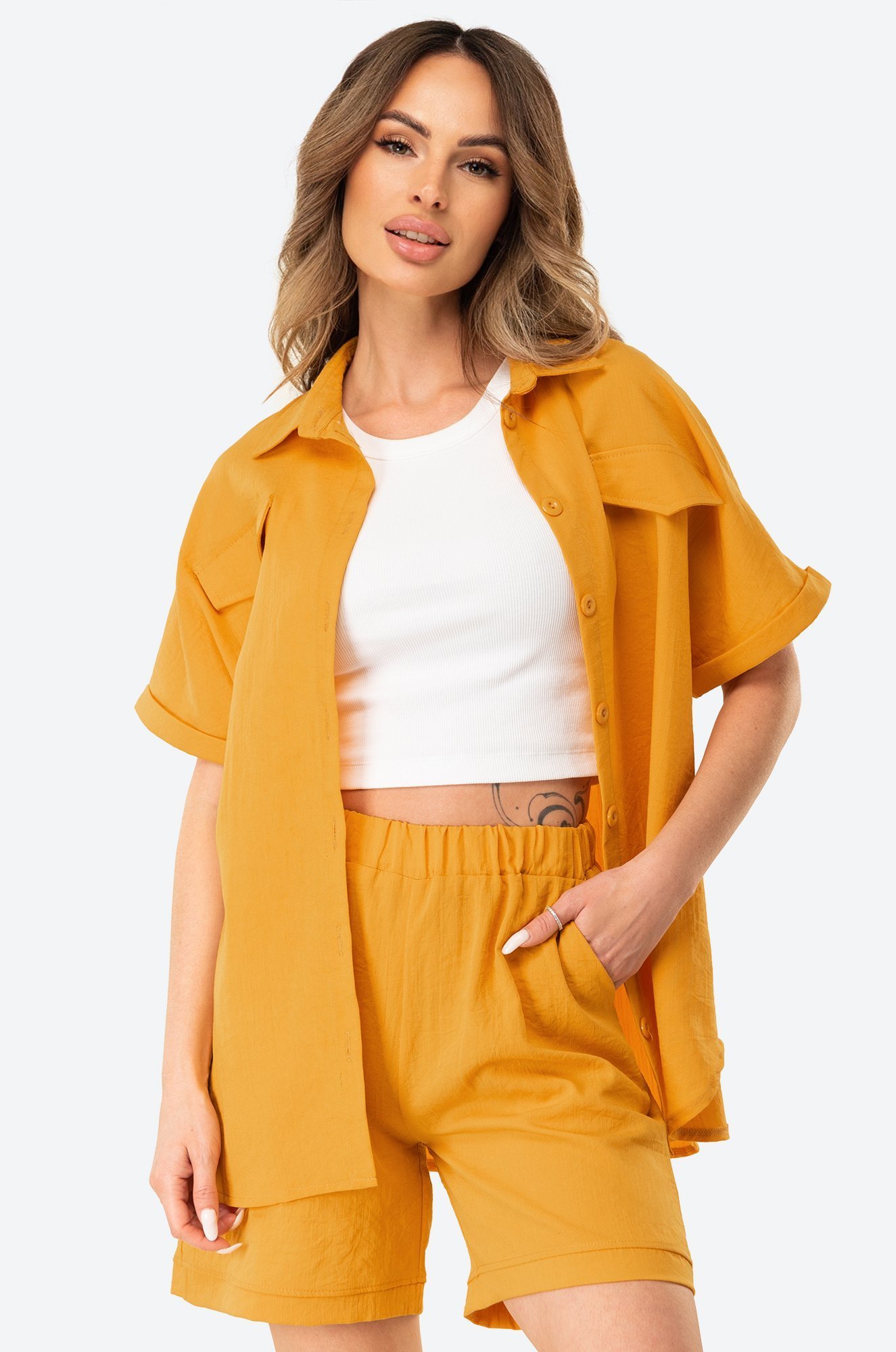 Костюм двойка для женщин включает в себя свободные шорты с карманами и рубашку с коротким цельнокроеным рукавом. Шортики с высокой посадкой и эластичным поясом на резинке подойдут для любого типа фигуры. Низ шорт и рукава рубашки дополнены подворотами. Рубашка с клапанами имеет удобную застежку на пуговицы.