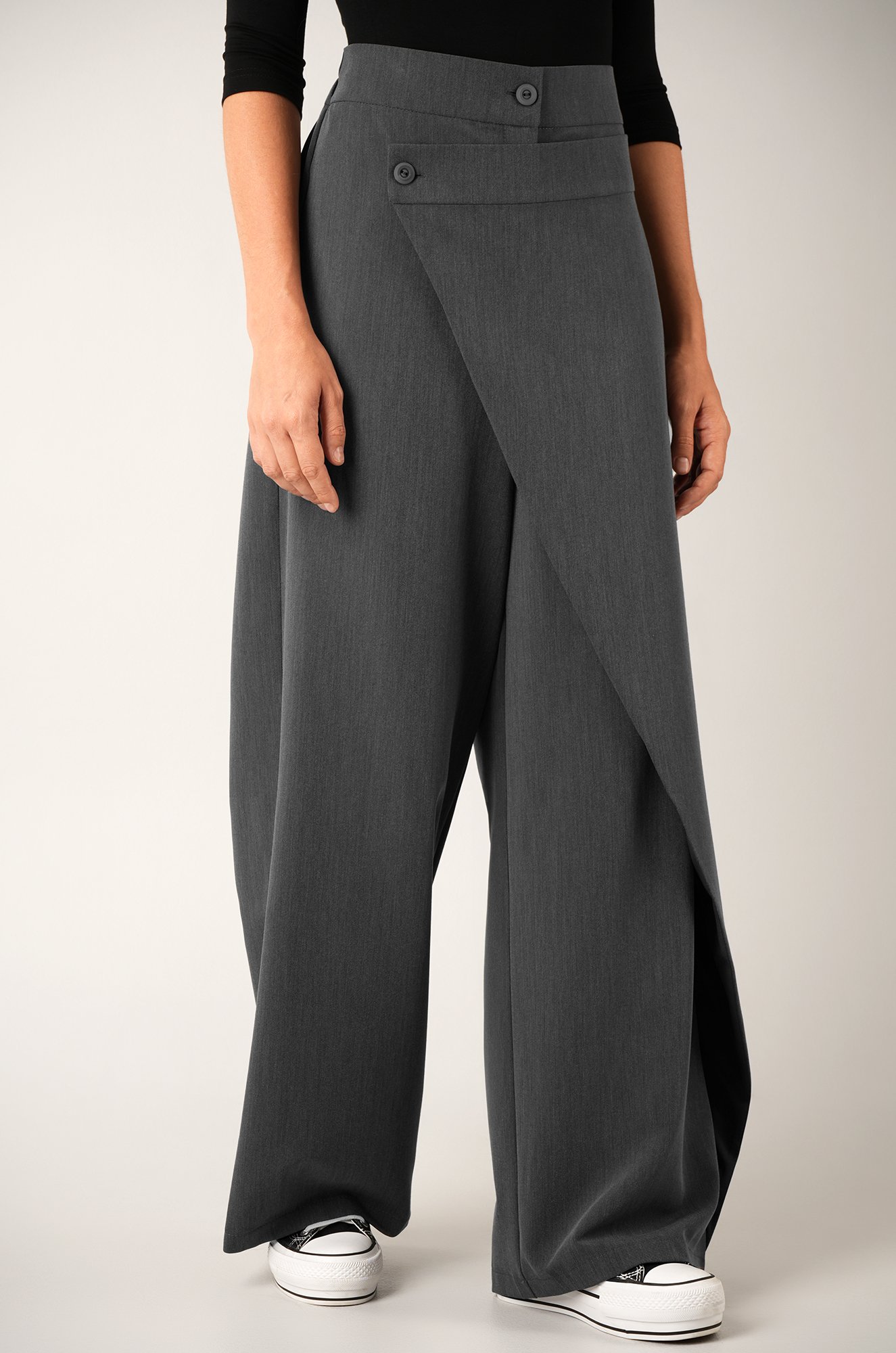 Стильные асимметричные женские брюки в..показать элегантном сером цвете — идеальное сочетание комфорта и изящества. Классика с оригинальными элементами в виде запаха и аккуратной застёжки на пуговицу подчеркнёт индивидуальность и подойдёт для девушек и женщин, ценящих практичность и эстетику.