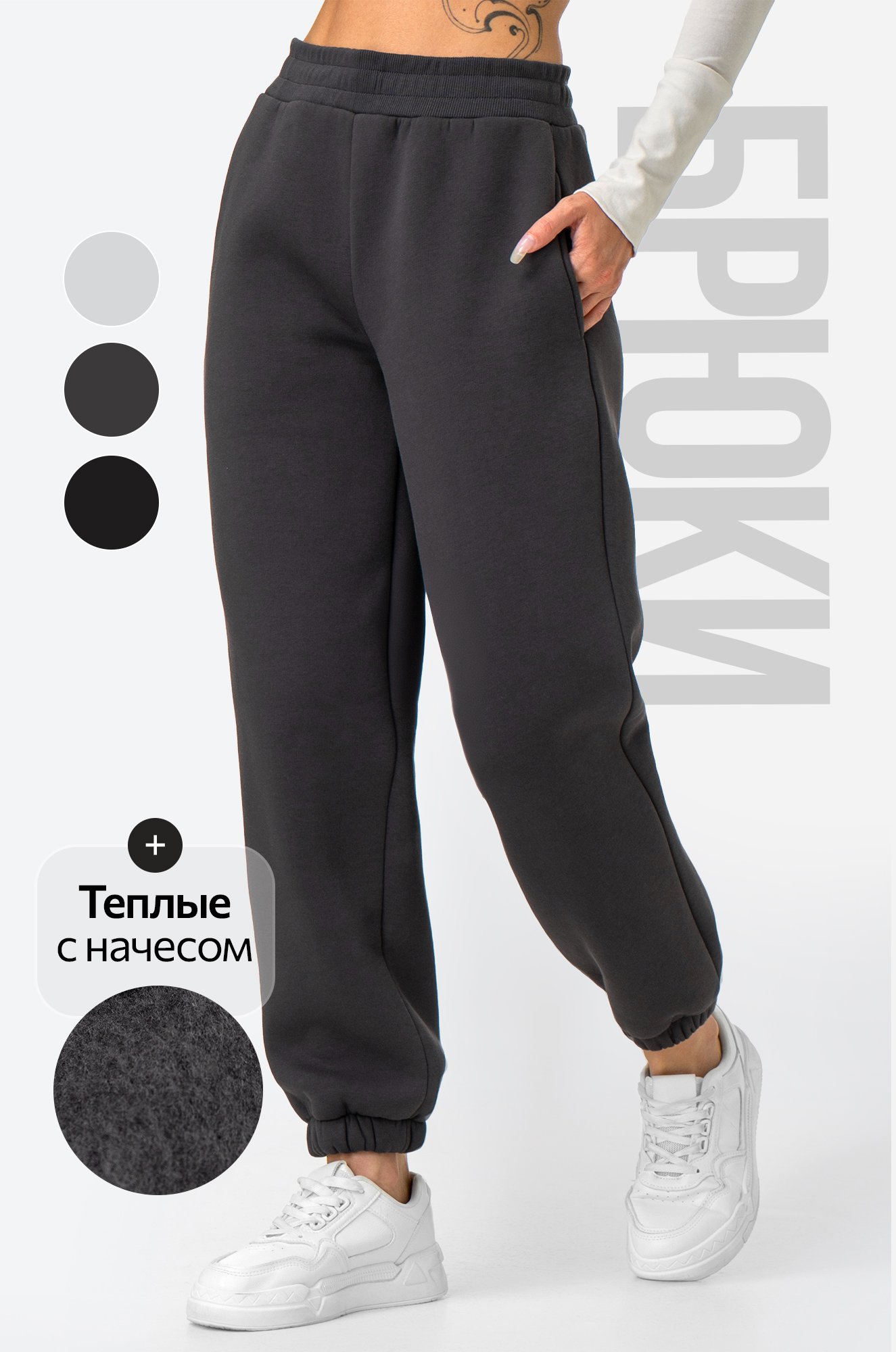 У..показатьтепленные женские брюки с начесом — отличный выбор для холодных дней и активного отдыха на природе. Темно-серые однотонные джоггеры выполнены из трикотажа футер с высоким содержанием хлопка и дополнены удобными боковыми карманами.