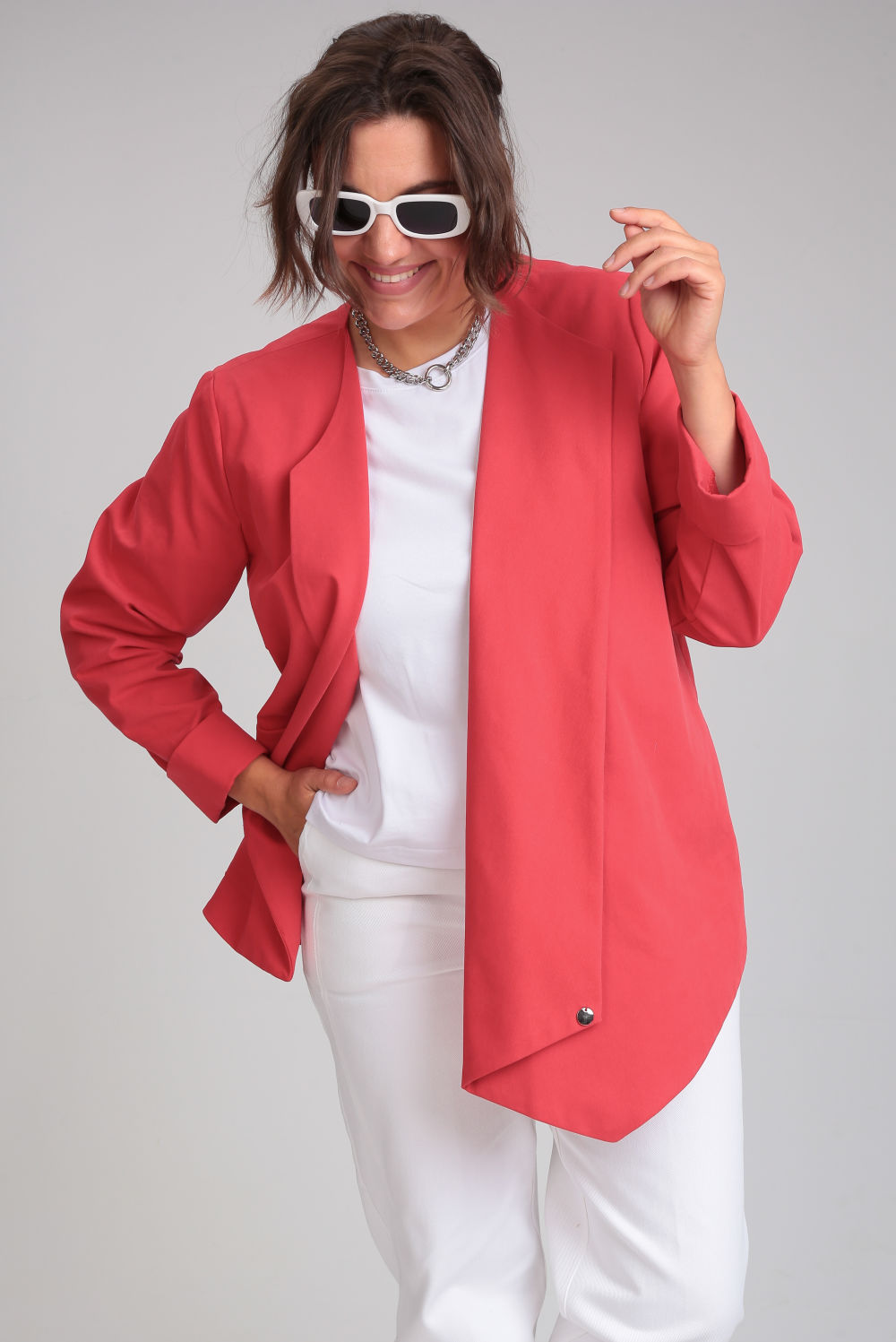 Эта модель точно добавит изюминку в деловой образ! Модель полуприлегающего силуэта без застежки - отлично подходит для завершения стильного образа. Женственный классический пиджак оверсайз прямого кроя с асимметричными удлиненными передними полами. Выполнен из хлопковой ткани. Глубокий V-образный вырез оформлен отложным воротником. Рукава оформлены отворотом. Ассиметричный нижний край спереди - визуально стройнит.  Достаточно свободный силуэт не сковывает движений.  Шикарно будет с блузами и рубашками на работу, на учебу в школу, колледж, университет.