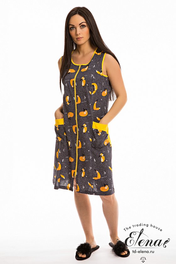 Халат без рукавов с центральной застёжкой на молнию. По бокам расположены два накладных кармана. Горловина, проймы и карманы обработаны бейкой из контрастного по цвету полотна.