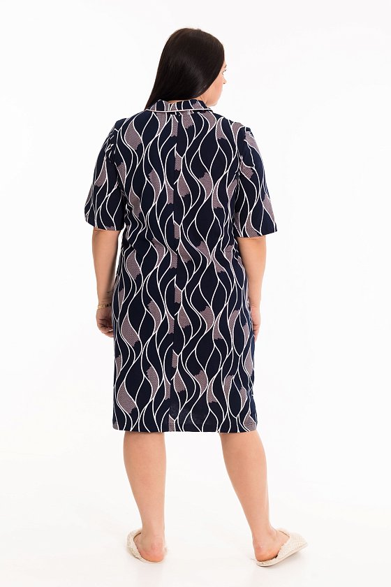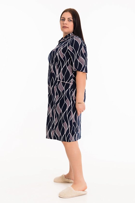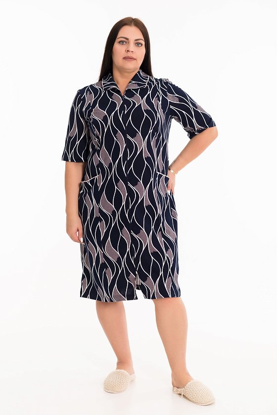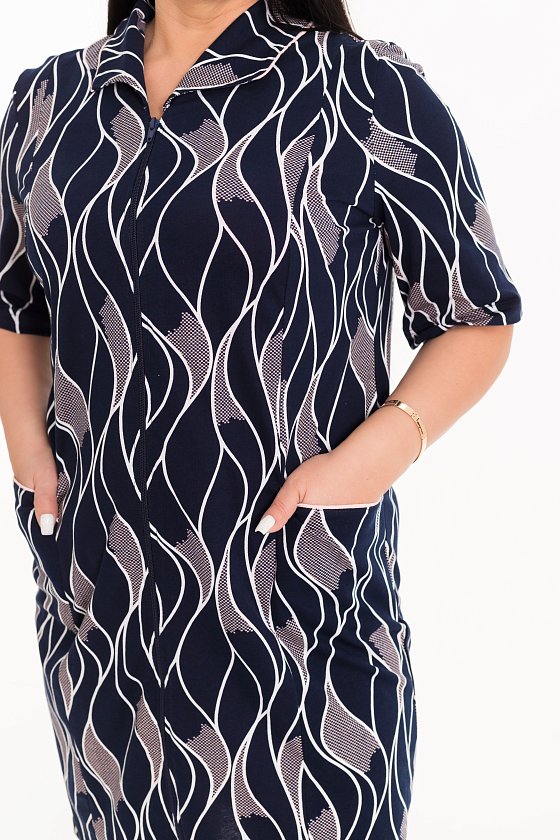 Женский халат из кулирки, выполненный из 100% хлопка в синем цвете с набивным рисунком - уютный и стильный. Халат с отложным воротником прямого кроя. Длина рукавов до локтя обеспечит комфорт и свободу движения. Застежка на молнию делает надевание халата быстрым и удобным. Наличие карманов по бокам на полочках добавляет удобства и функциональности. Кант в цвет рисунка, отделывающий воротник и верх карманов, придает халату изысканный вид и дополнительный акцент к дизайну. Этот женский халат станет отличным выбором для повседневного использования дома.