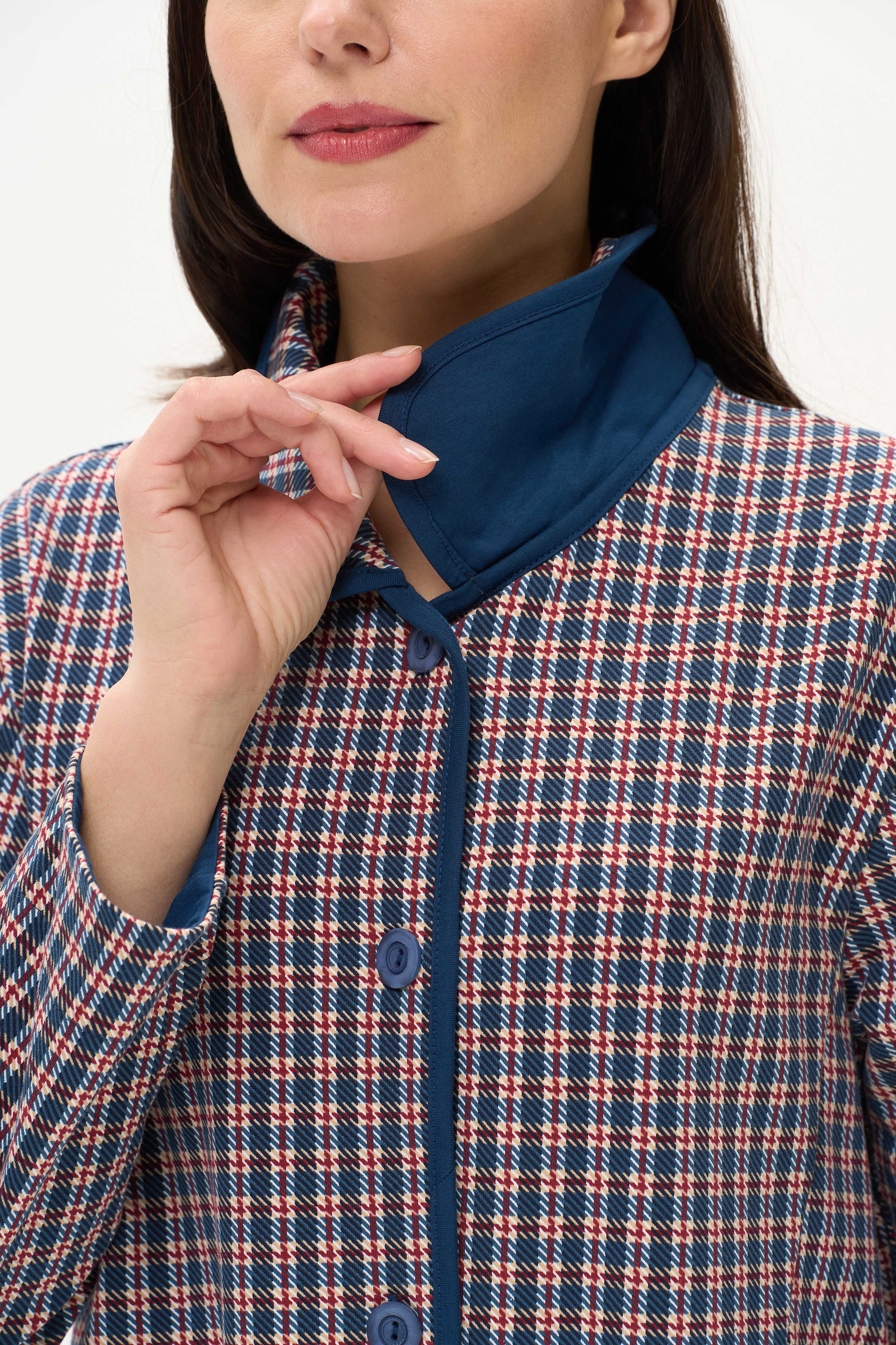 Тёплый халат из хлопкового трикотажного футера. Элегантный отложной воротник, длинные втачные рукава. Застёжка на пуговицы, накладные карманы. Рост модели на фото 170 см.