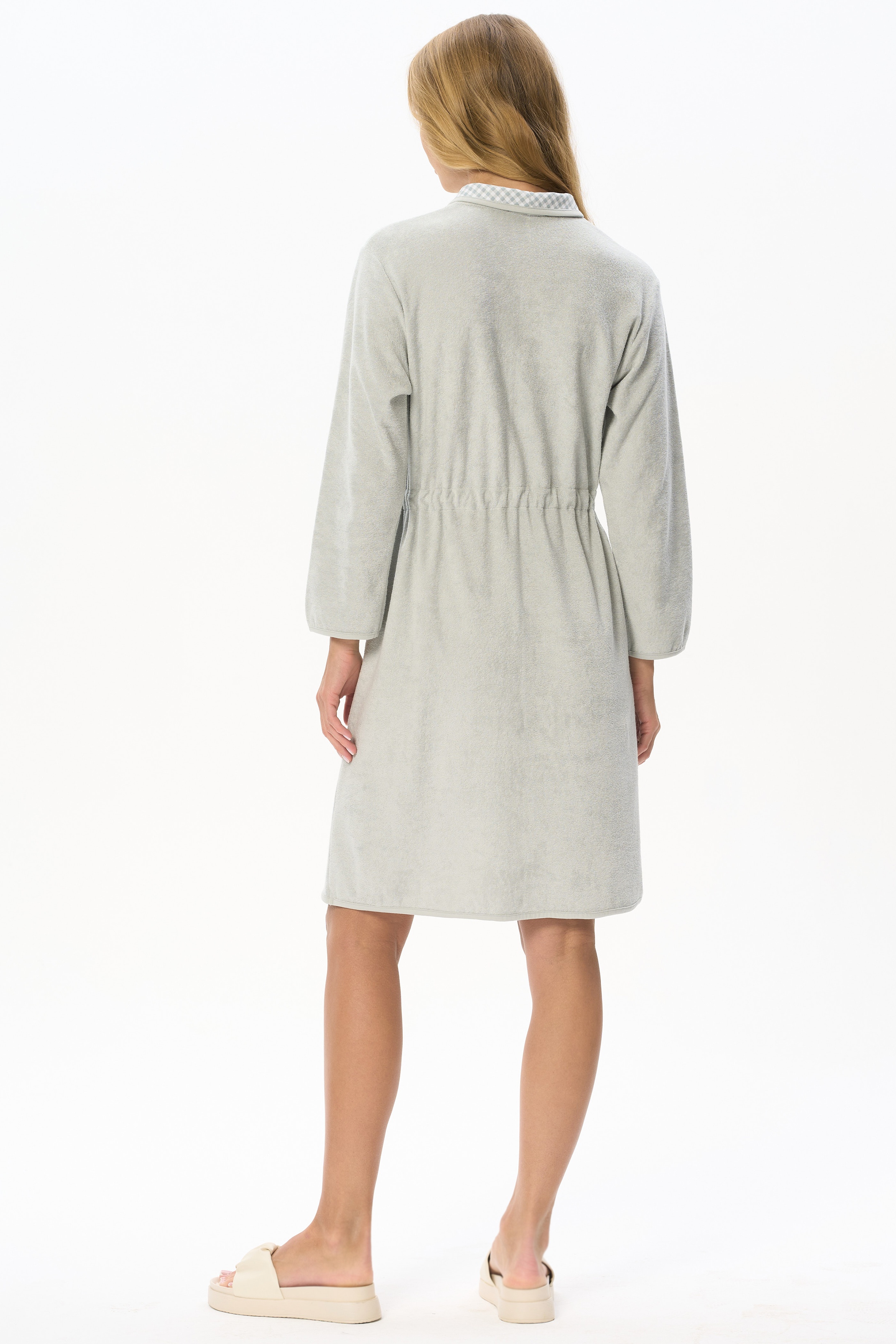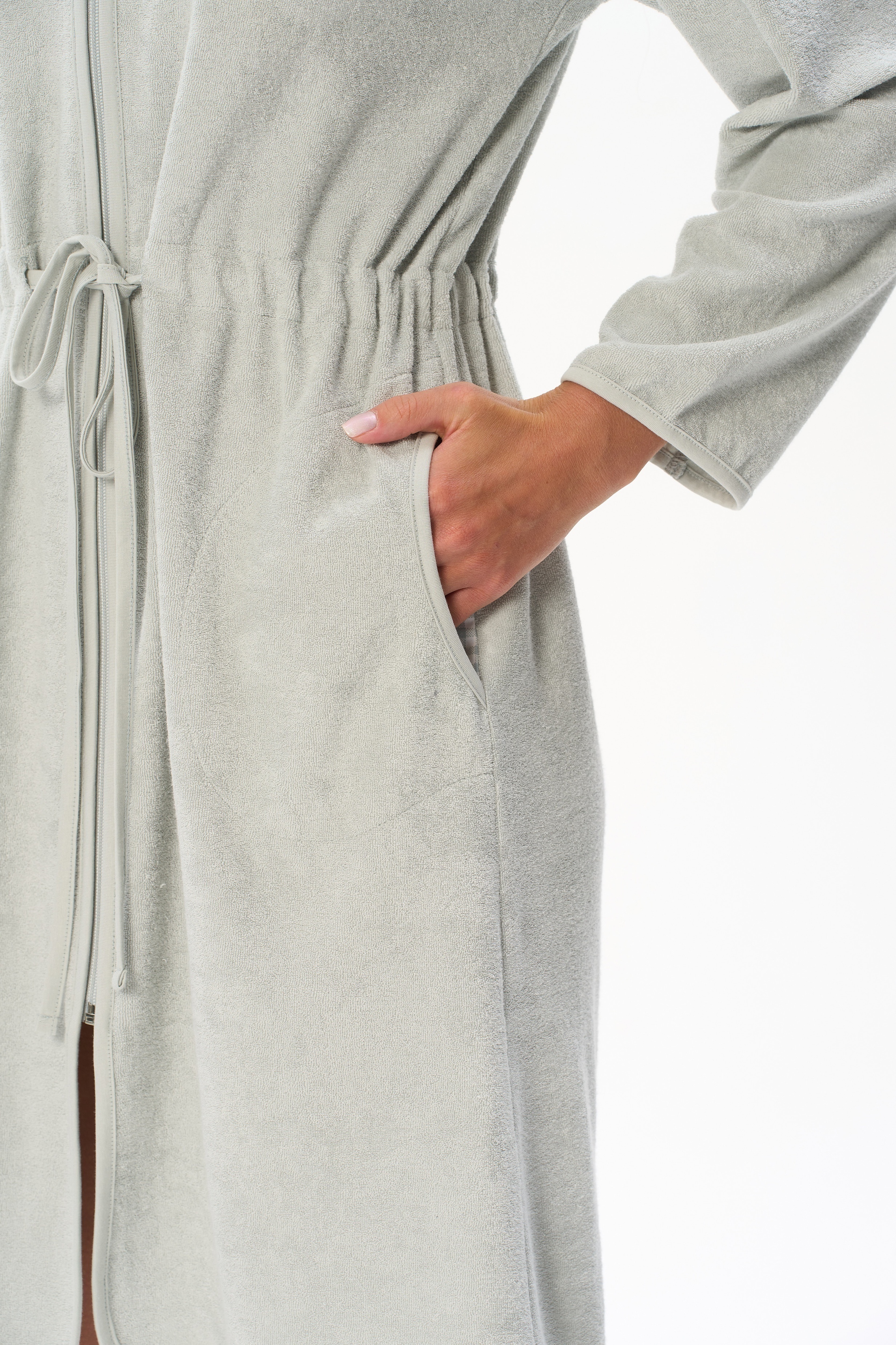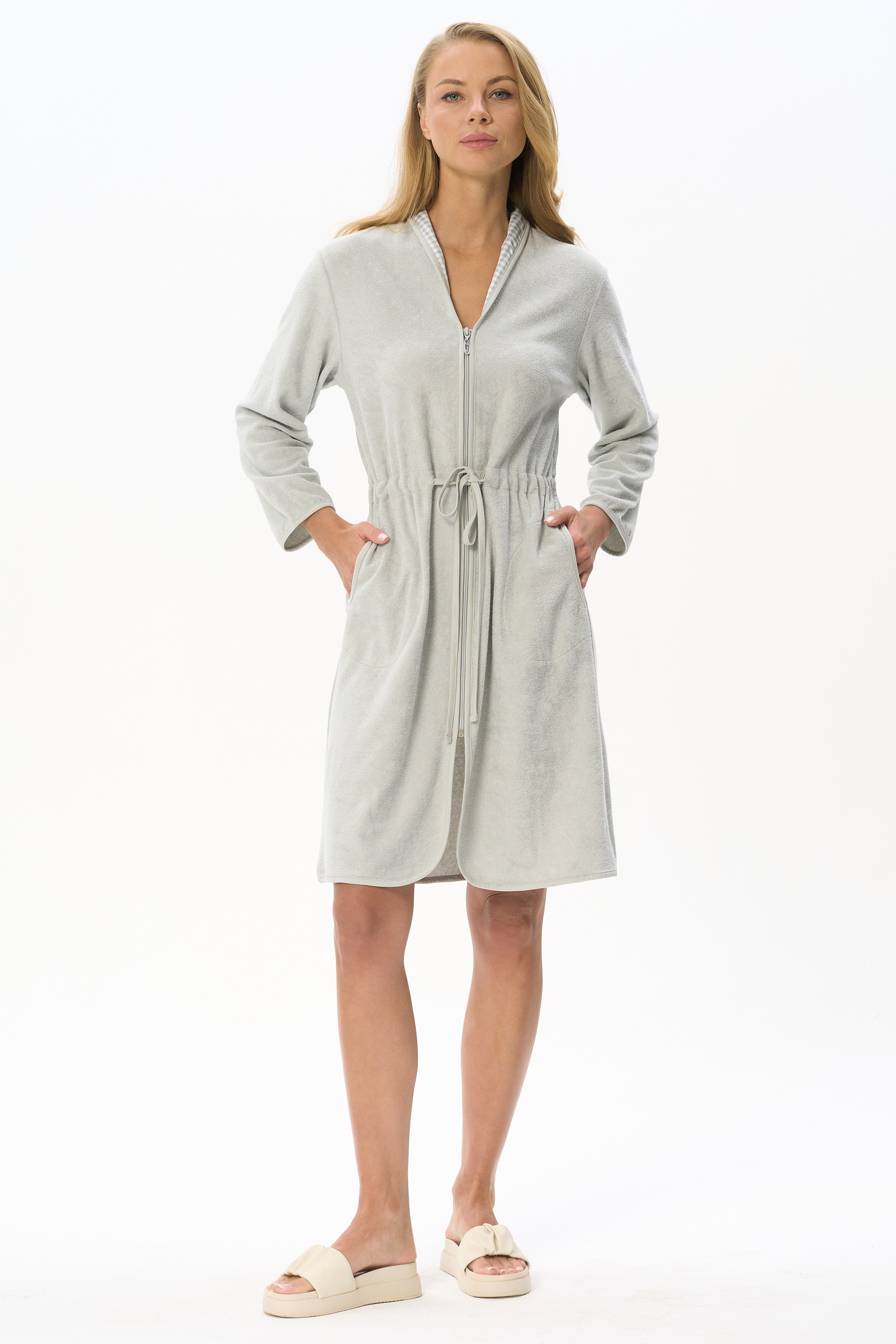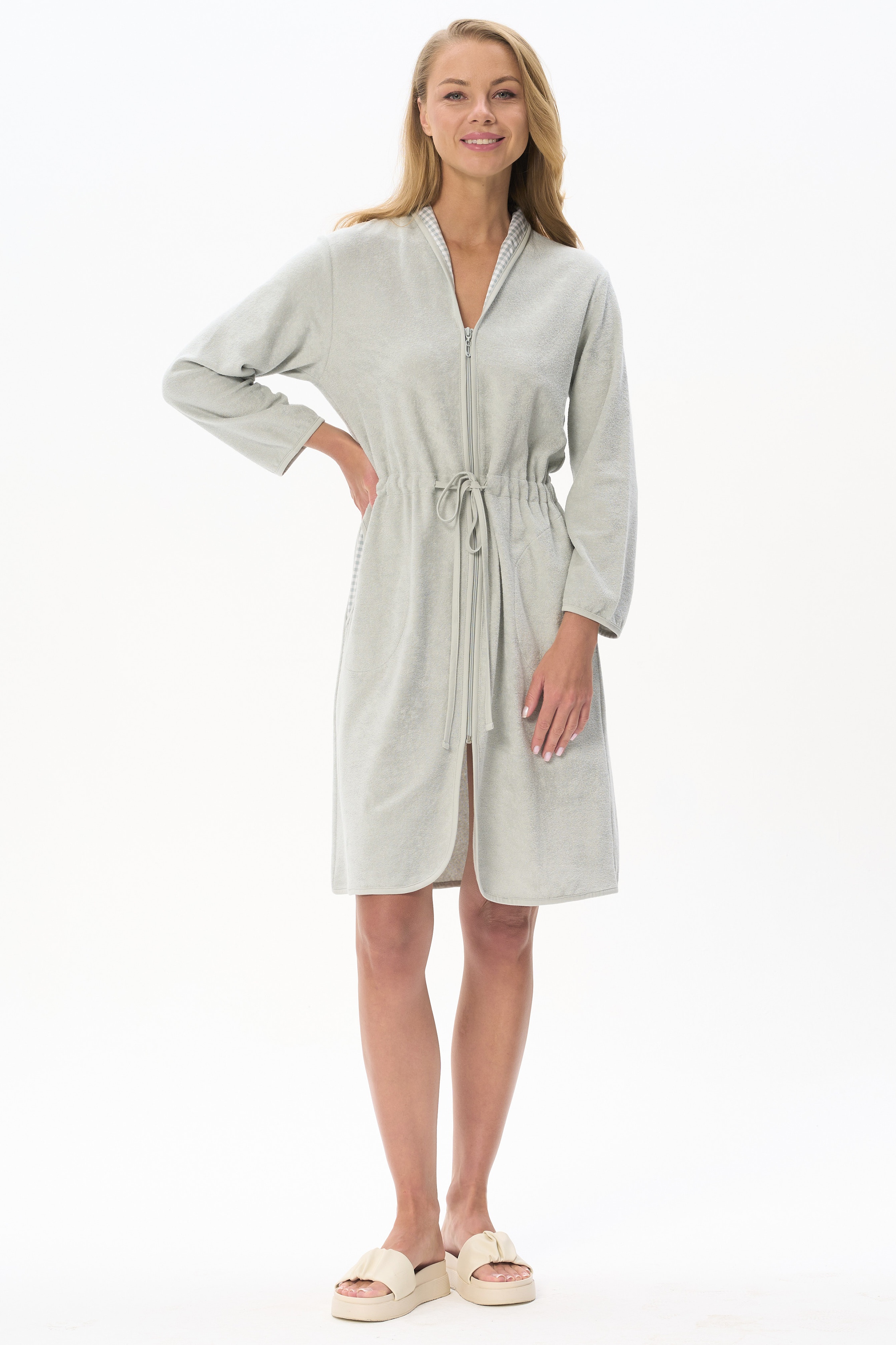 80% хлопок, 20% полиэстер Комфортный халат из вискозной махры с поясом на кулиске. Воротник шалька из хлопкового полотна кулирка. Застежка центральная на молнию, в боковых швах карманы. Рост модели на фото 175 см.