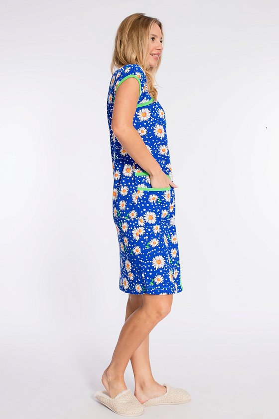 Халат выполнен из хлопковой ткани с набивкой. Короткий рукав со сборкой, центральная застёжка на молнию, спереди расположены карманы. В качестве отделки горловина, борта халата, рукава и карманы обработаны бейкой контрастного цвета.