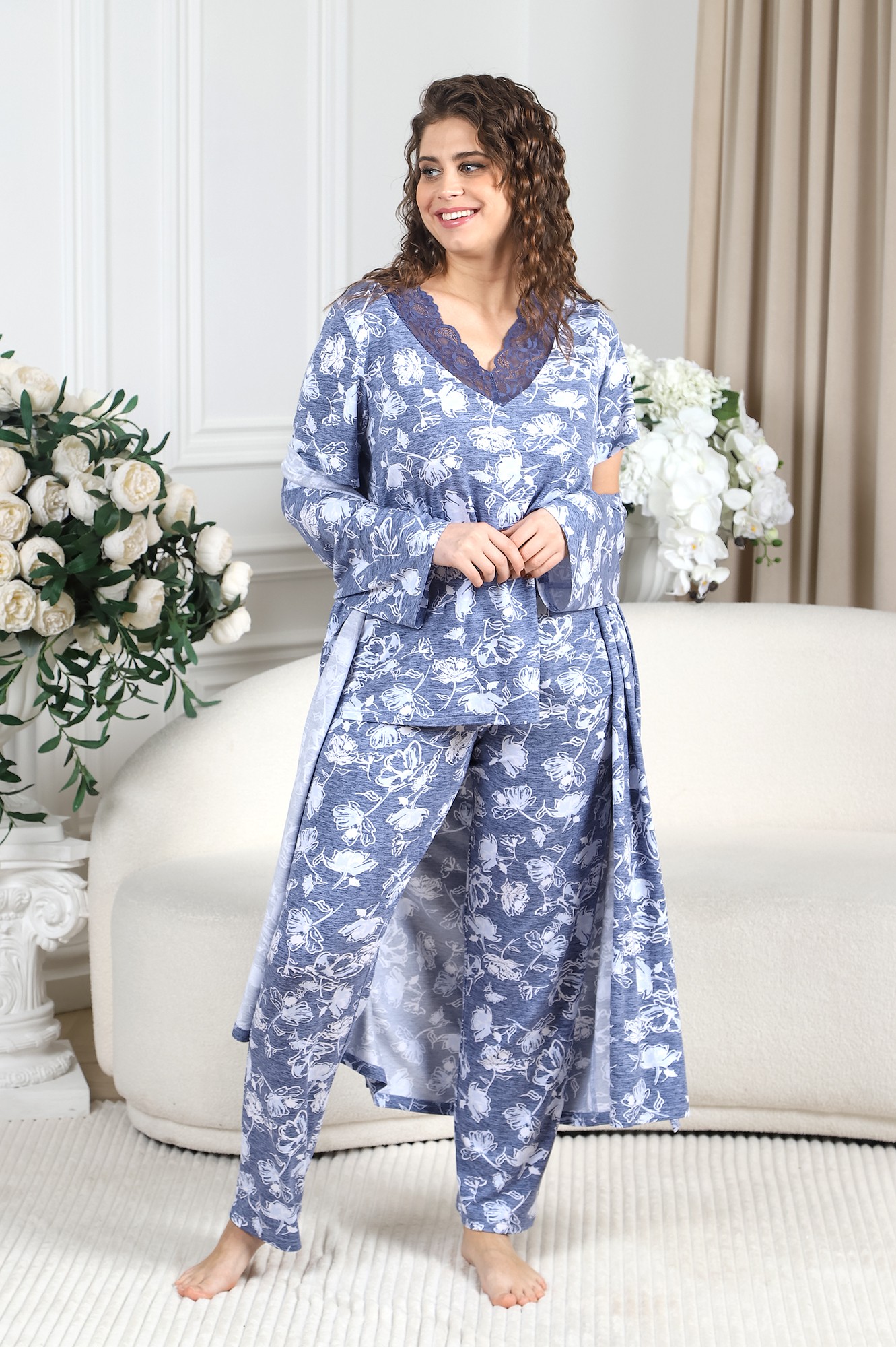 Пижама женская из вискозного трикотажного полотна с набивным рисунком, состоящая из футболки и брюк. Футболка – прямая, с короткими втачными рукавами. Полочка с V – образными кружевными деталями по горловине.Брюки - свободного покроя с эластичной тесьмой по талии.