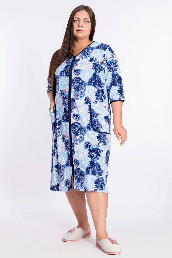 Халат женский из велюра с застёжкой на молнию. Покрой прямой, горловина с V-образным вырезом, два накладных кармана по бокам, рукав 3/4. Горловина, низ рукавов и карманы обработаны бейкой.