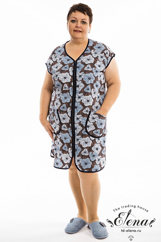 Халат женский укороченный, выполнен из набивной хлопковой ткани. Рукав цельнокроеный, горловина имеет V- образный вырез, центральная застёжка на молнию. Спереди расположены два накладных кармана. В качестве отделки бейка из однотонного полотна контрастного цвета.