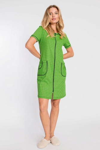 Халат на молнии выполнен из х/б полотна. Рукава короткие, на левой полочке нанесён принт. В боковых швах размещены карманы.