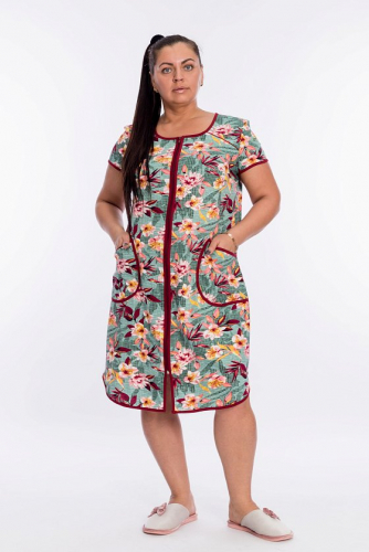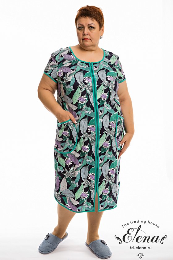 Халат с коротким рукавом выполнен из кулирки с набивкой. Центральная застёжка на молнию. Спереди расположены накладные карманы. Горловина, рукава, низ и борта халата обработаны отделочной бейкой.