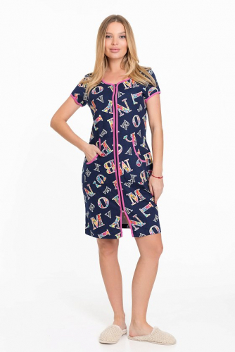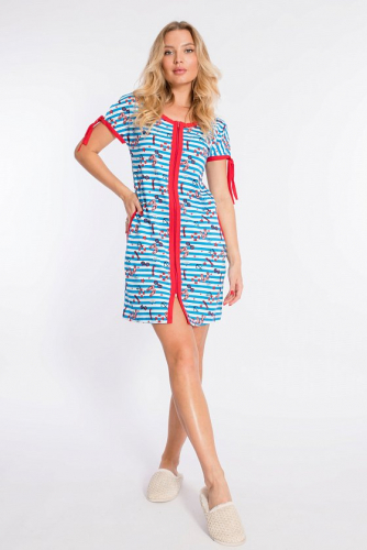 Халат выполнен из х/б полотна с набивкой. Застёжка на молнию, по бокам расположены карманы. Горловина обработана контрастной по цвету бейкой.
