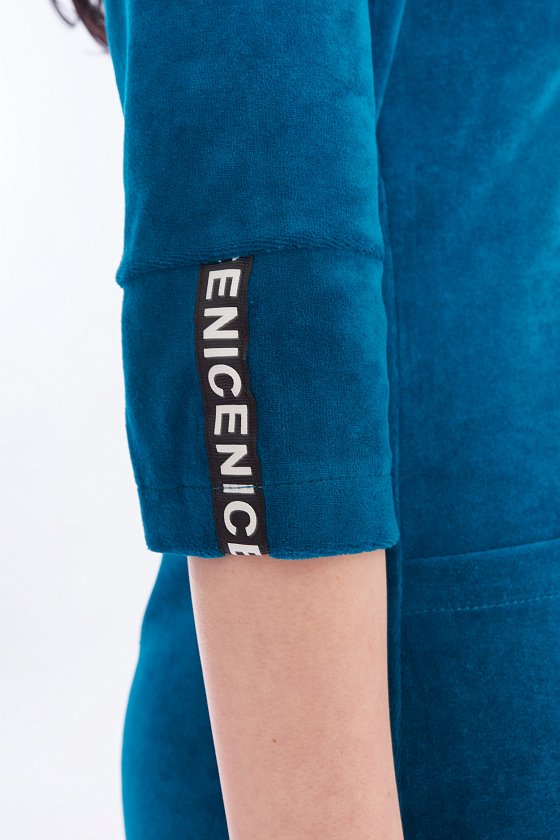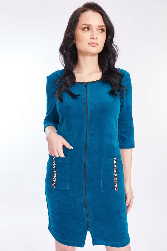 Халат выполнен из велюра. Центральная застёжка на молнию, рукава длиной 3/4. Спереди расположены два накладных кармана. На рукавах и карманах в качестве отделки настрочена репсовая лента.
