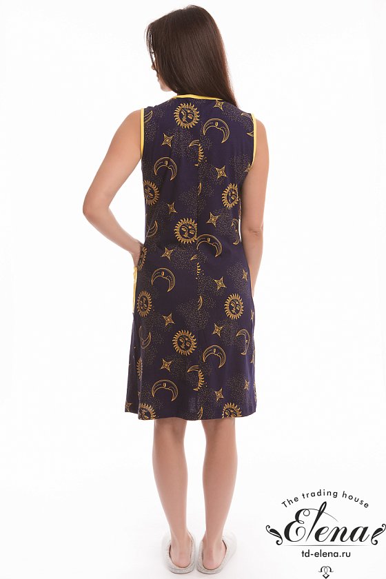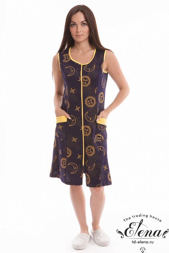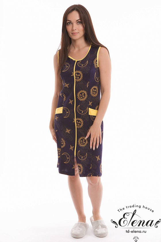 Халат без рукавов с центральной застёжкой на молнию. По бокам расположены два накладных кармана. Горловина, проймы и карманы обработаны бейкой из контрастного по цвету полотна.