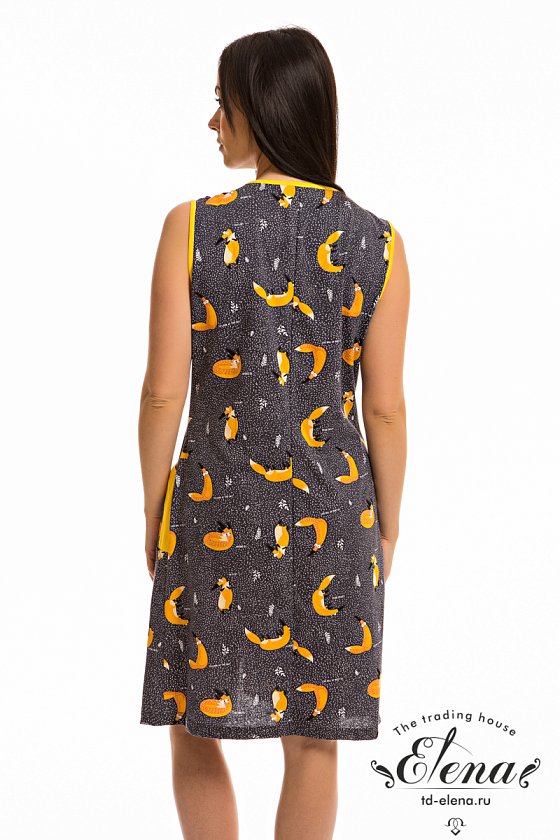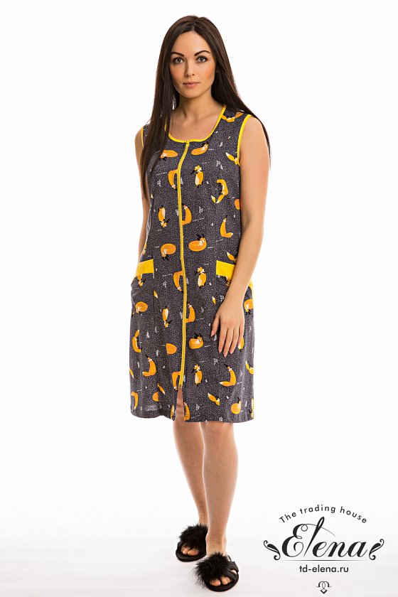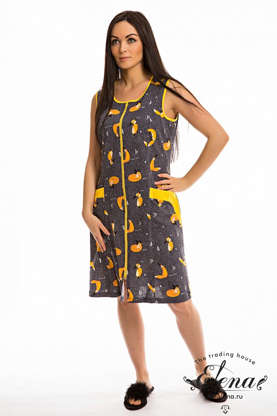 Халат без рукавов с центральной застёжкой на молнию. По бокам расположены два накладных кармана. Горловина, проймы и карманы обработаны бейкой из контрастного по цвету полотна.