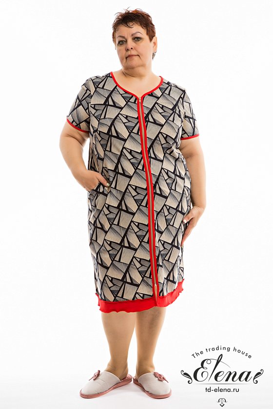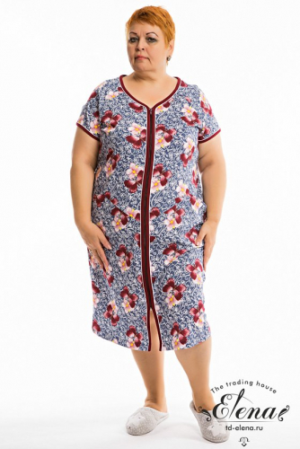 Халат свободного силуэта с застёжкой на молнию. Выполнен из х/б полотна. Короткие рукава, горловина и борта халата обработаны бейкой контрастного цвета. По бокам расположены карманы.