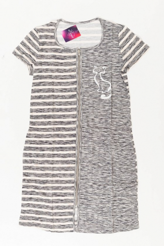 Халат выполнен из х/б полотна с набивным рисунком. Спереди застёжка на молнию и карманы. Горловина, низ рукавов, борта и вход в карманы обработаны бейкой контрастного цвета.