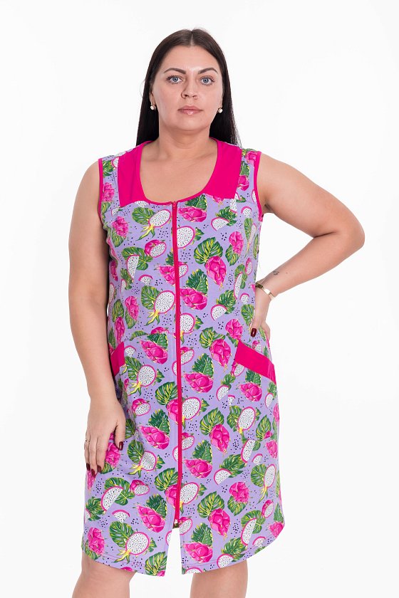 Халат выполнен из хлопкового полотна с набивным рисунком с отделкой деталями из однотонного полотна, без рукавов, с центральной застёжкой на молнию. Спереди два накладных кармана.
