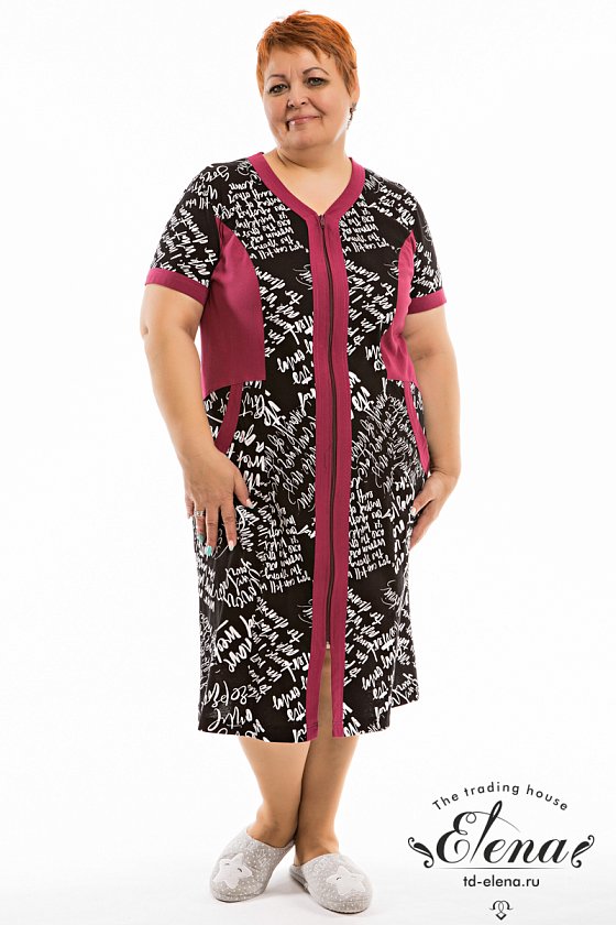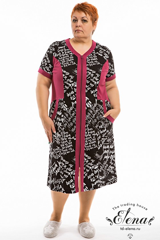 Халат выполнен из кулирки с набивным рисунком со вставками из однотонного отделочного полотна. Рукава короткие, втачные. Спереди расположены накладные карманы, центральная застёжка на молнию.