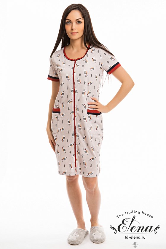 Халат с застёжкой на молнию выполнен из х/б полотна с набивным рисунком. Спереди накладные карманы. Горловина обработана бейкой с кантом, низ рукавов и верх карманов украшены двойными планками из отделочного полотна.