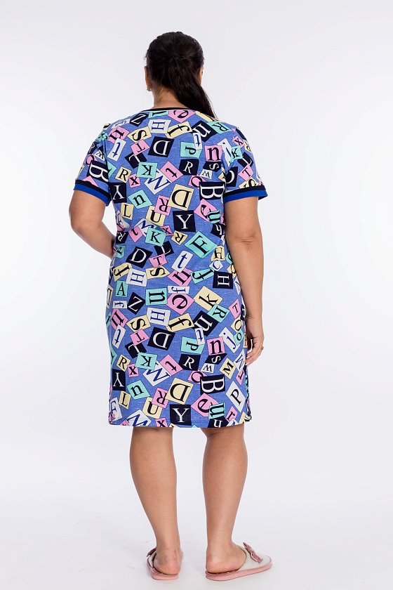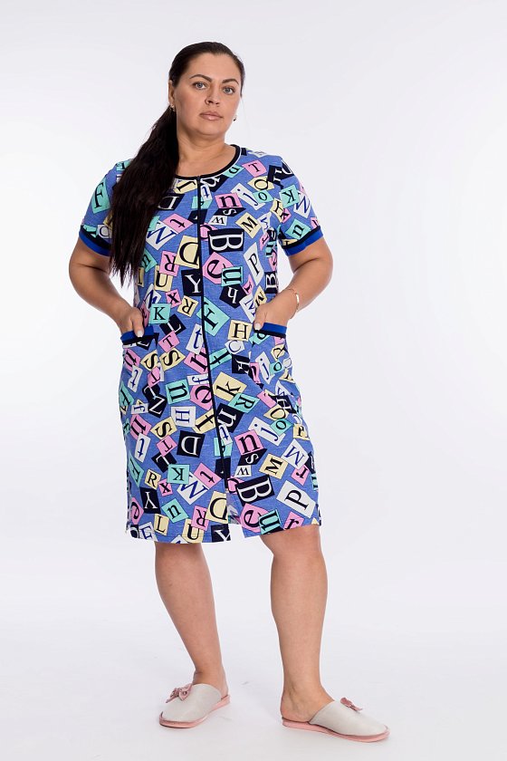 Халат с застёжкой на молнию выполнен из х/б полотна с набивным рисунком. Спереди накладные карманы. Горловина обработана бейкой с кантом, низ рукавов и верх карманов украшены двойными планками из отделочного полотна.