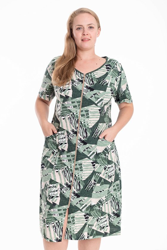 Женский халат из кулирки с набивным рисунком — практичный и удобный вариант для дома. Модель прямого кроя с короткими рукавами и круглым вырезом горловины подчёркивает женственность и обеспечивает свободу движений. Застёжка на молнии делает халат удобным в использовании, а накладные карманы добавляют функциональности. Контрастная бейка по горловине и бортам служит стильным акцентом. Натуральное хлопковое полотно приятно к телу и дарит комфорт в течение всего дня.