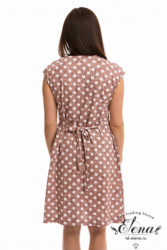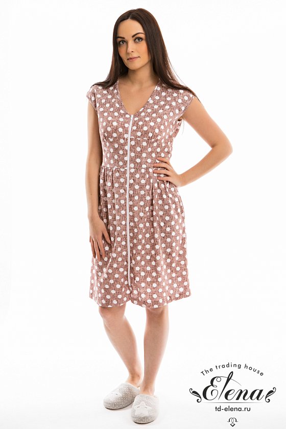 Халат выполнен из х/б полотна с набивным рисунком. Халат застёгивается на молнию, в боковых швах расположены карманы. Горловина и проймы обработаны бейкой. Сзади расположен фиксирующий по талии пояс.