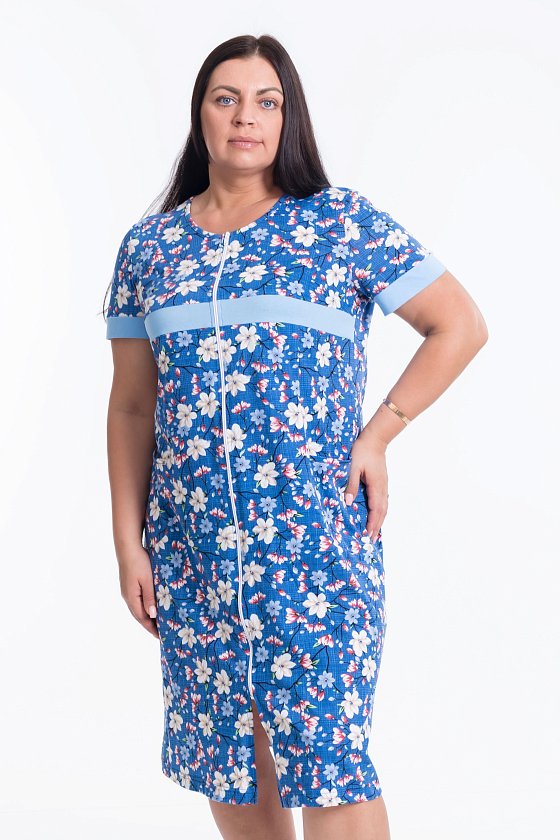 Халат застёгивается на молнию, что обеспечивает удобство. Спереди и на рукавах расположены вставки из отделочного полотна, которые придают изделию стильный вид.