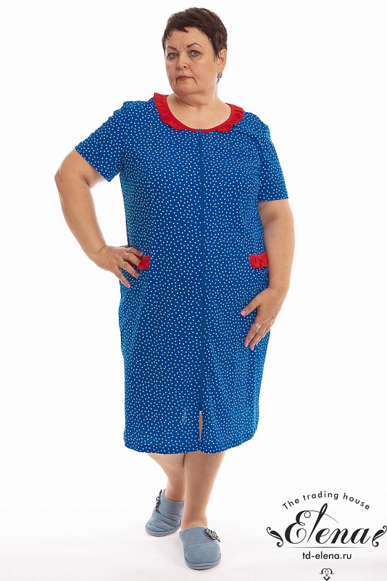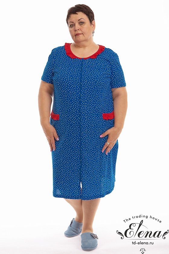 Халат женский из хлопкового полотна. Вырез горловины круглый, центральная застёжка на молнию. Спереди два накладных кармана. В качестве отделки по горловине и карманам рюши.