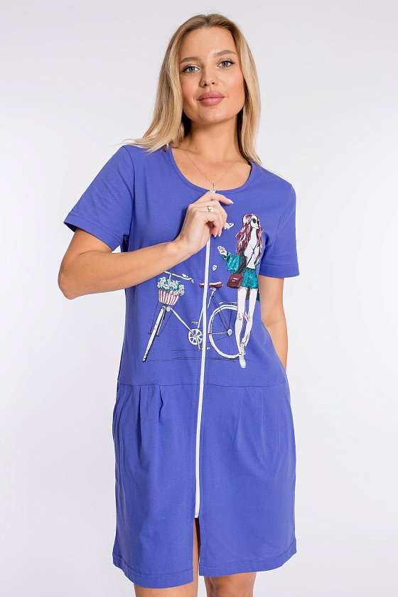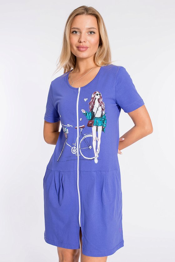 Халат на молнии выполнен из однотонной кулирки, 100% хлопок. По бокам размещены карманы, от отрезной линии талии заложены складки. Спереди нанесён красивый принт.