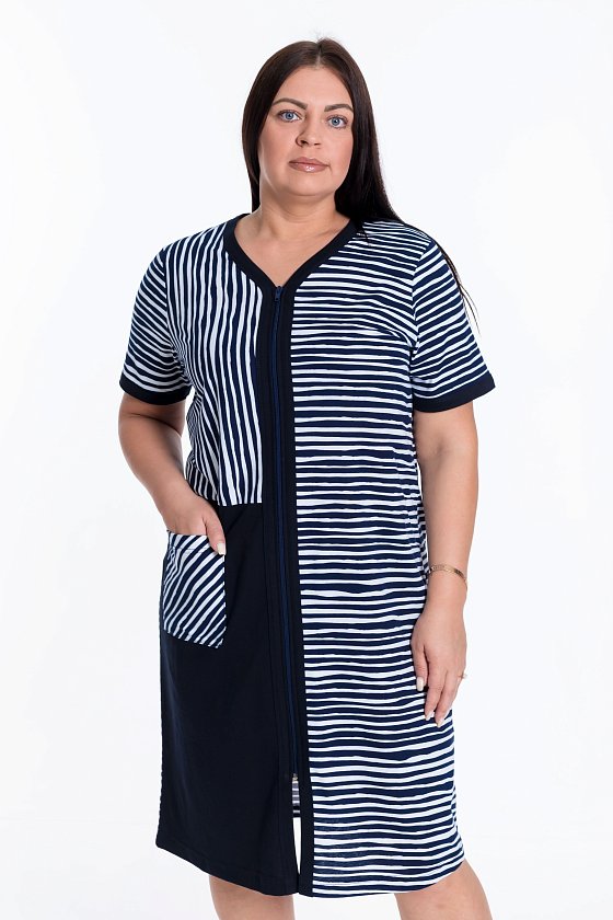 Халат с застёжкой на молнию выполнен из кулирки с рисунком в полоску с отделочными вставками из однотонного полотна. Халат с короткими рукавами и карманом спереди, в качестве дополнительной отделки используется широкая бейка.