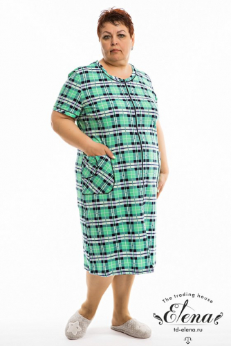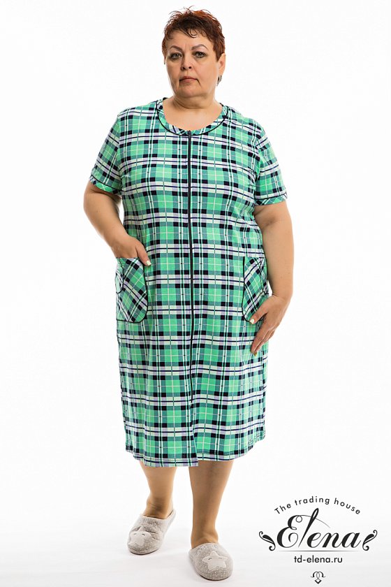 Халат с застёжкой на молнию выполнен из кулирки, 100% хлопок. Рукава короткие, спереди два накладных кармана. Вырез горловины, низ рукавов и карманы украшены отделочным кантом.